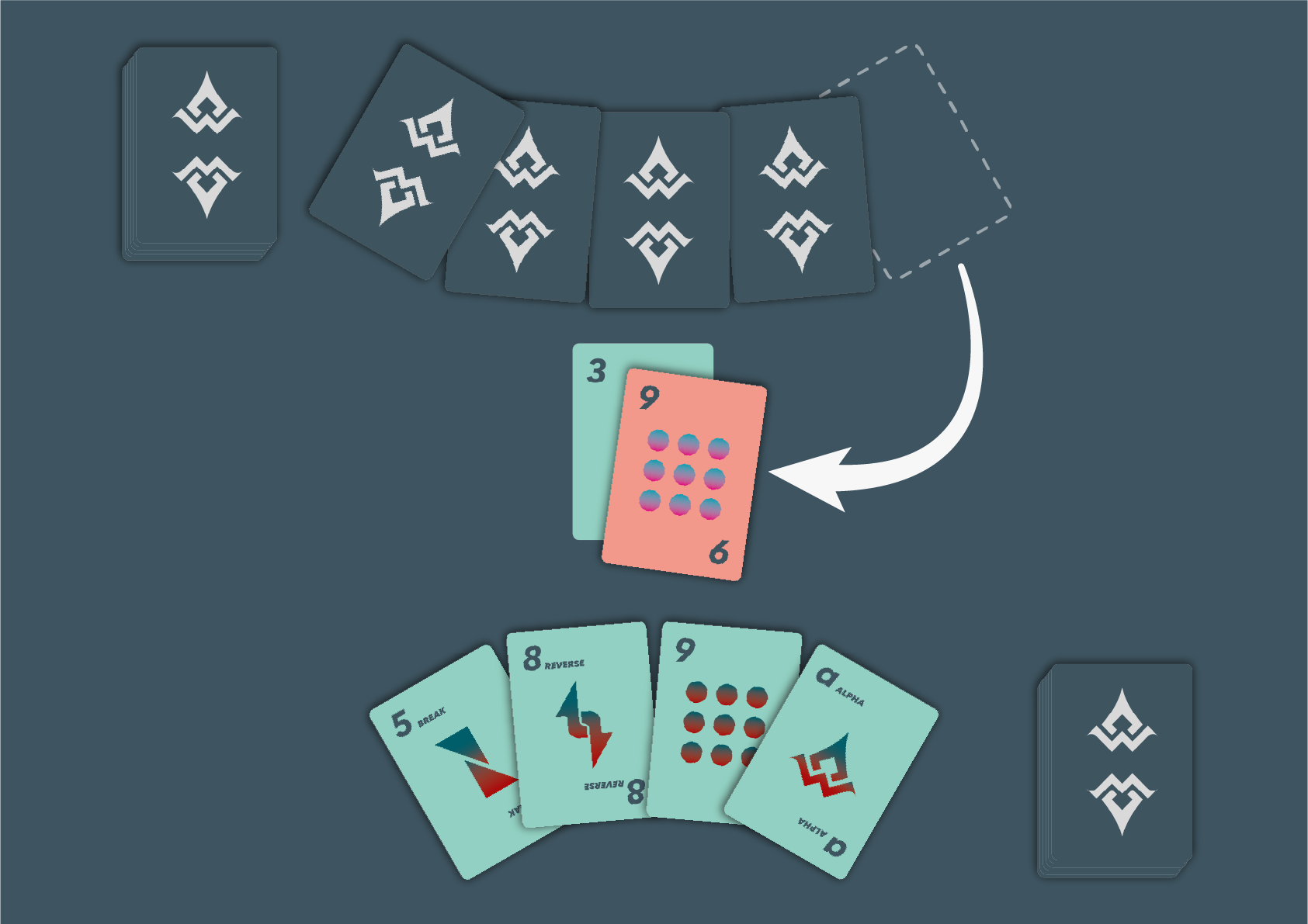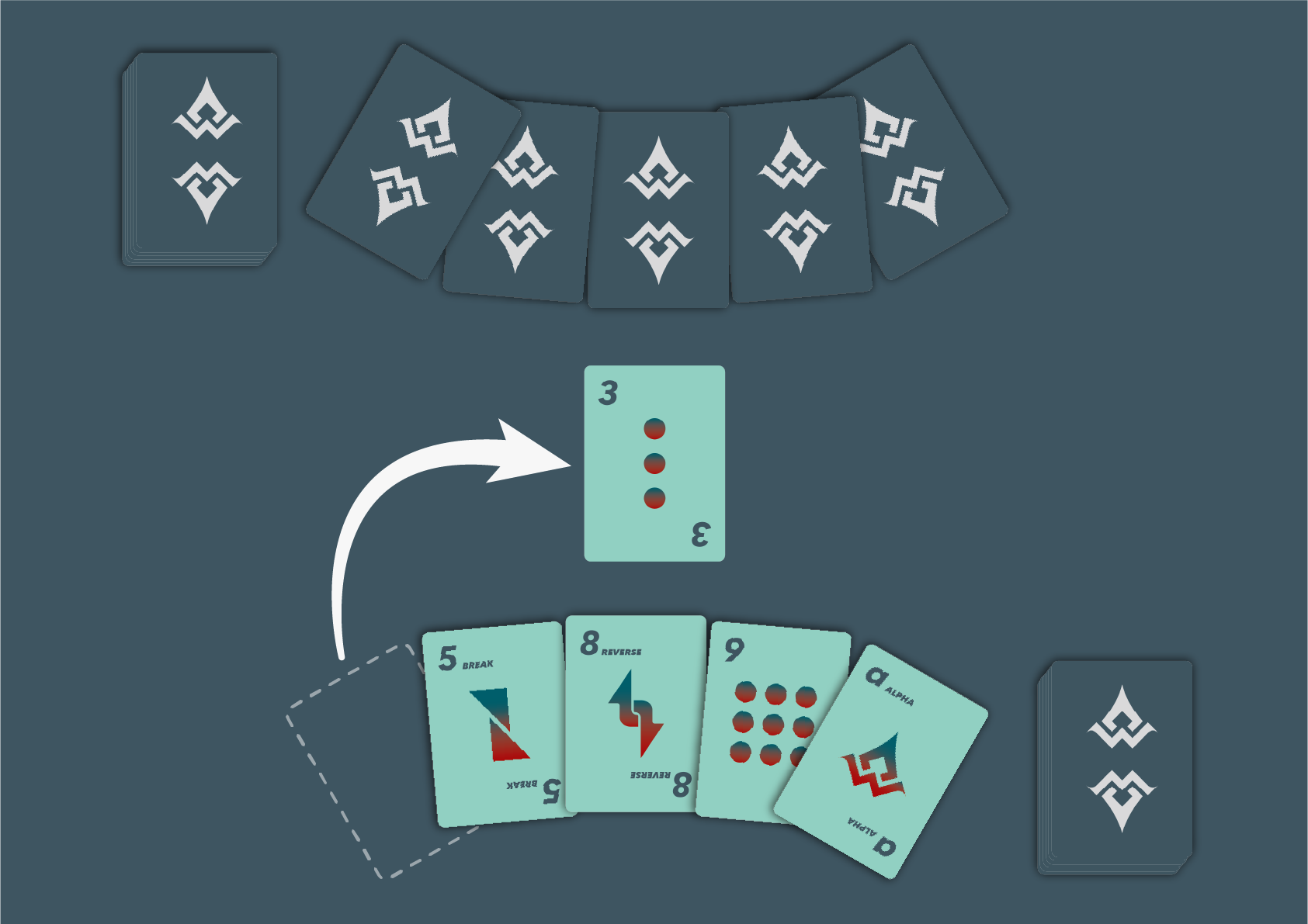 2. 山札から5枚引いて手札を作り、順番にカードを場に出していきます。