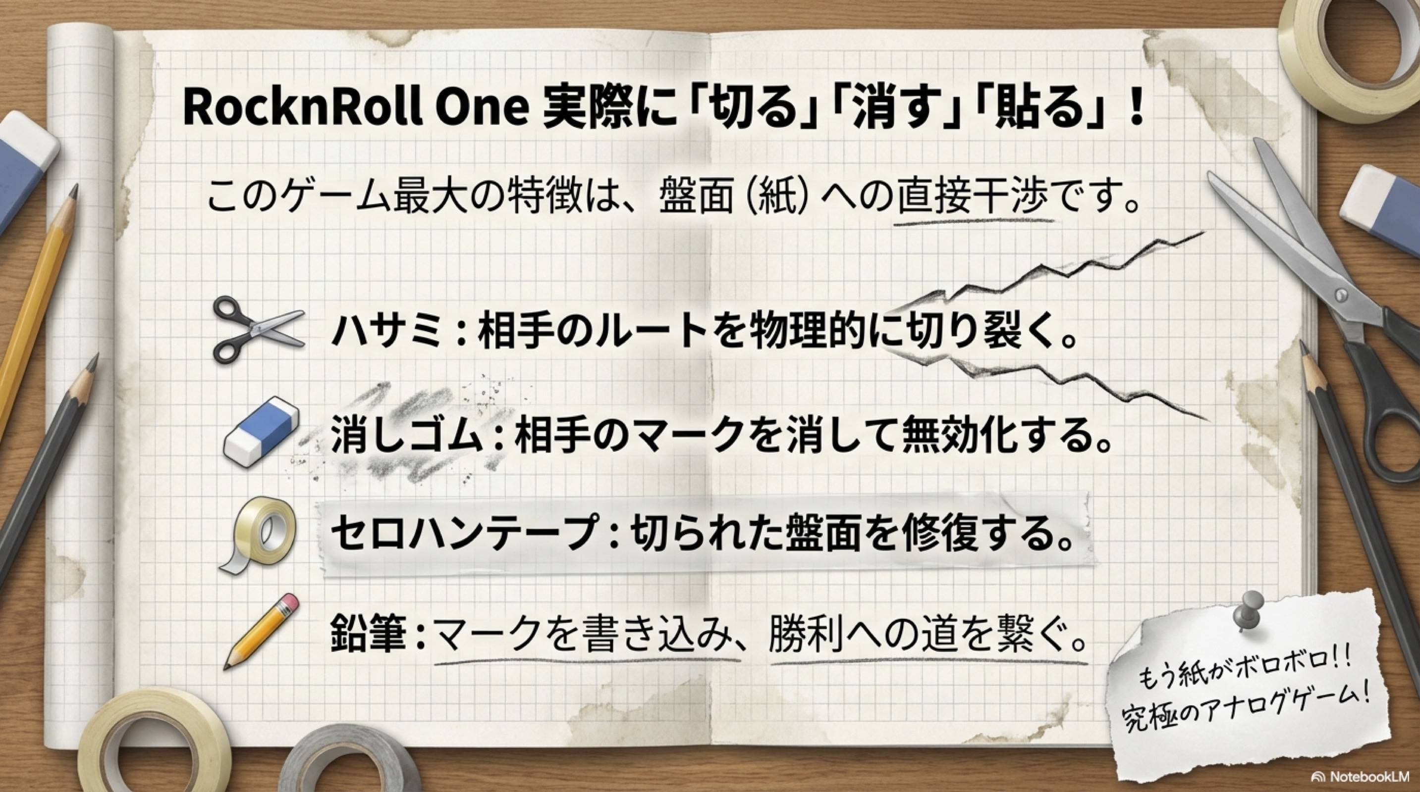 “繋げる”というのがポイントで、相手のマークの間をハサミで切って分断したり、セロハンテープで補修したり、消しゴムでマークを消したりして、文具の機能がそのままゲームのスキルとなります!
