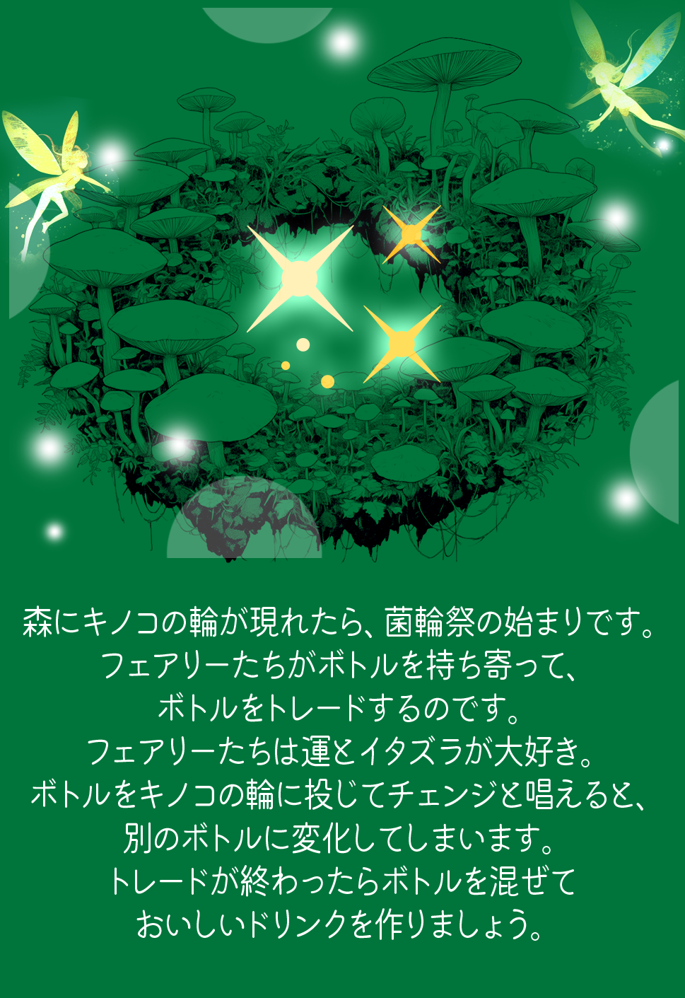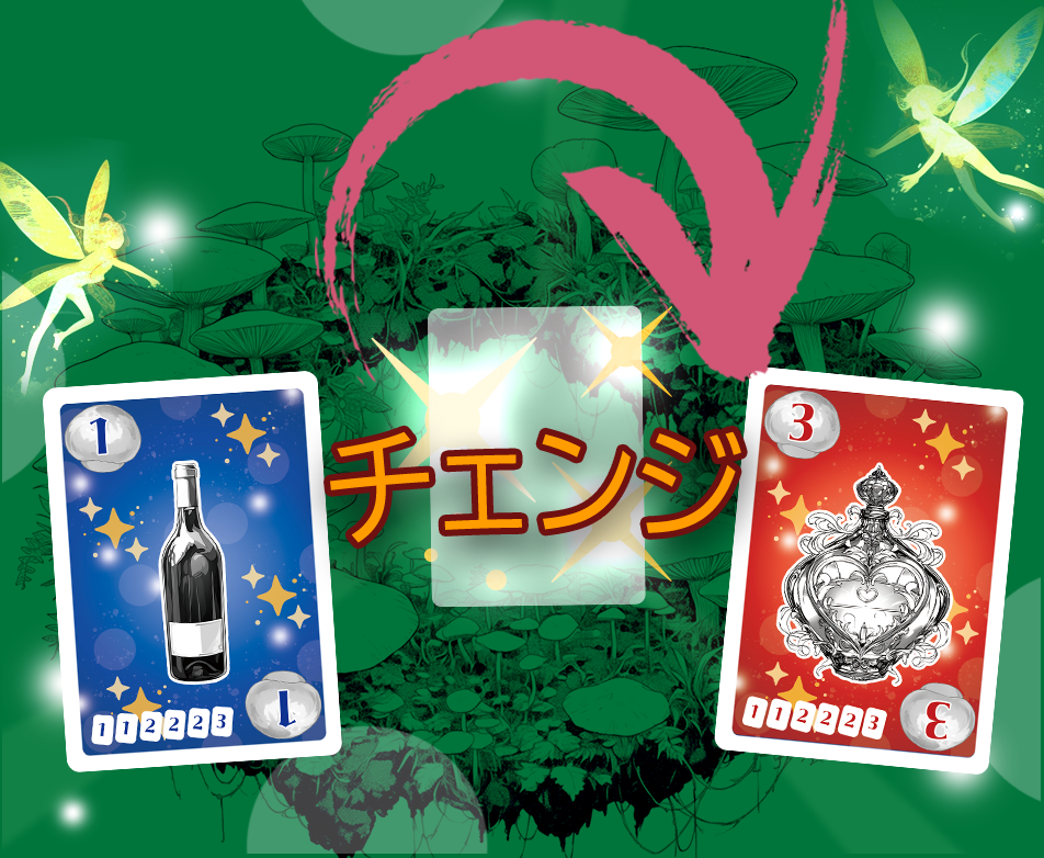 気に入らないボトル(カード)はチェンジでより良いカードに変えましょう(運試し)。相手が欲しがりそうなボトル(カード)があったらチェンジしてしまいましょう(イタズラ)。妖精たちのトレードは、現れては消えるキノコのように神出鬼没で自由気ままなのです。