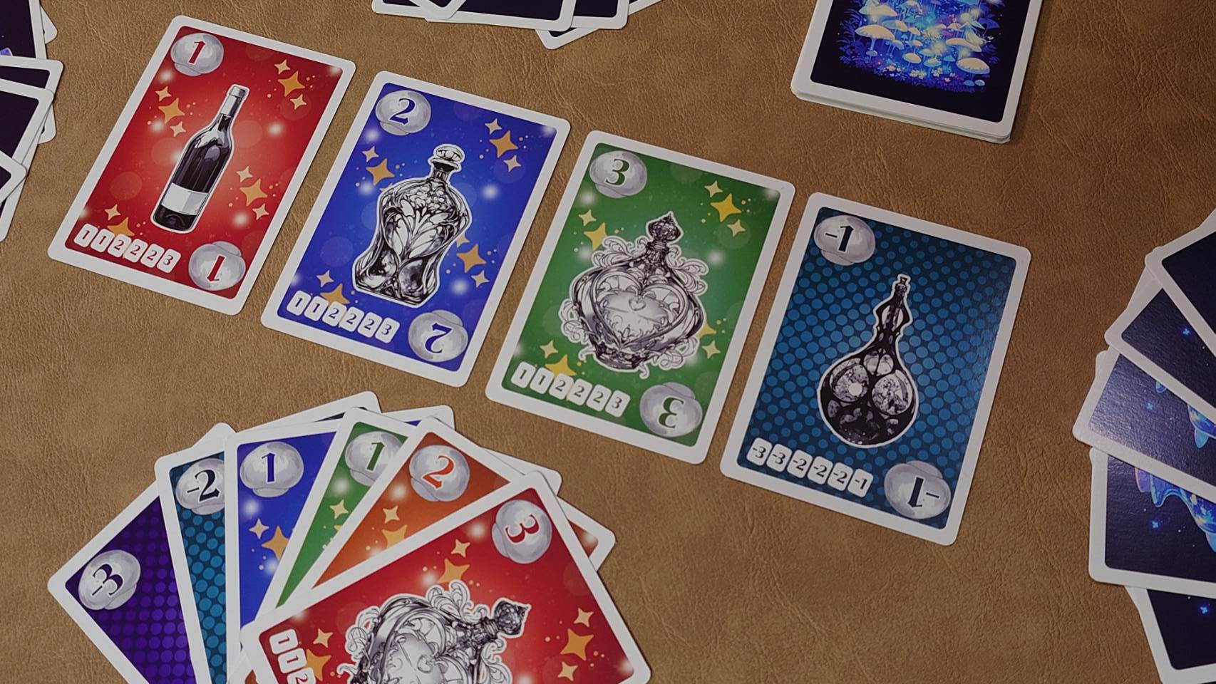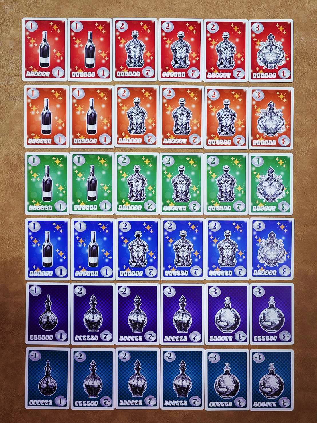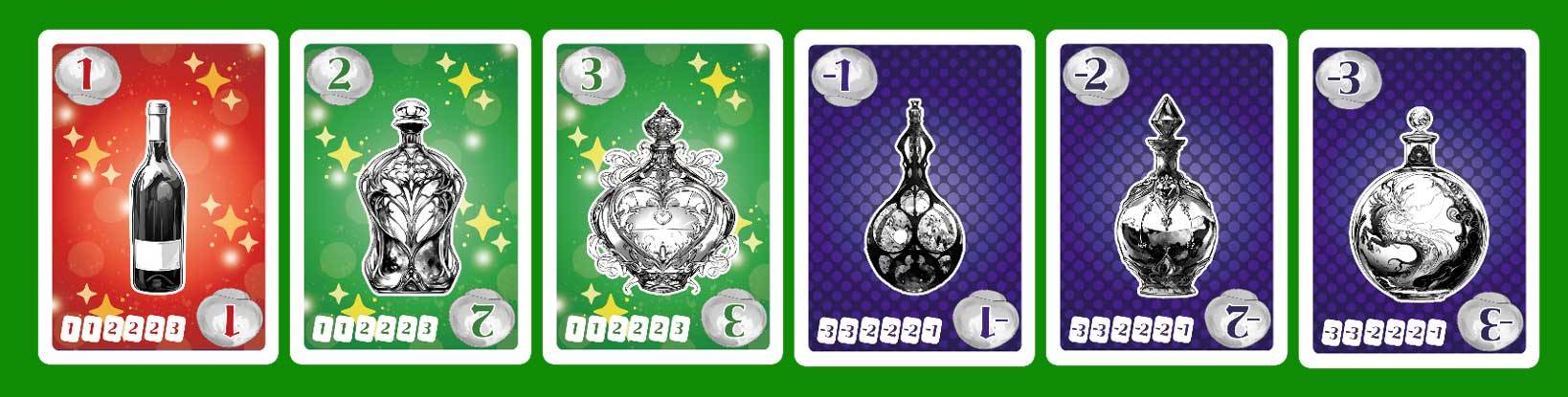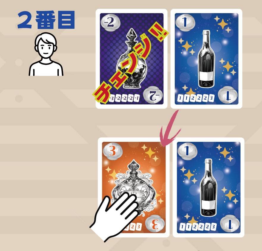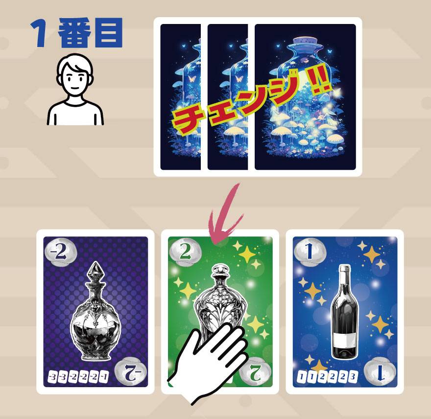 順番に手札からボトル(カード)を出した後、出されたボトル(カード)を順番に取っていく。それだけのゲームですが、取る前にチェンジを行うことで別のボトル(カード)に変化させることができます。