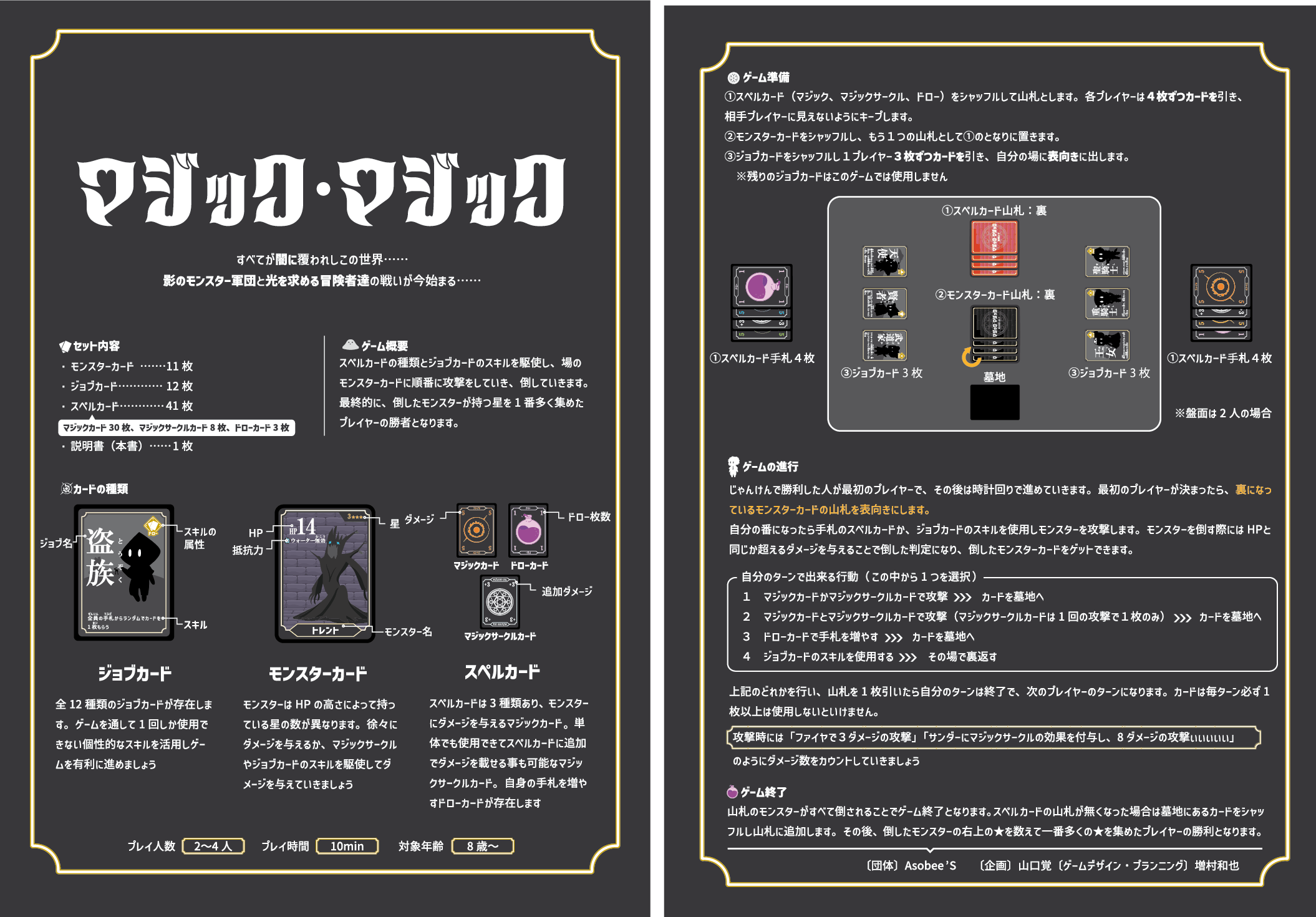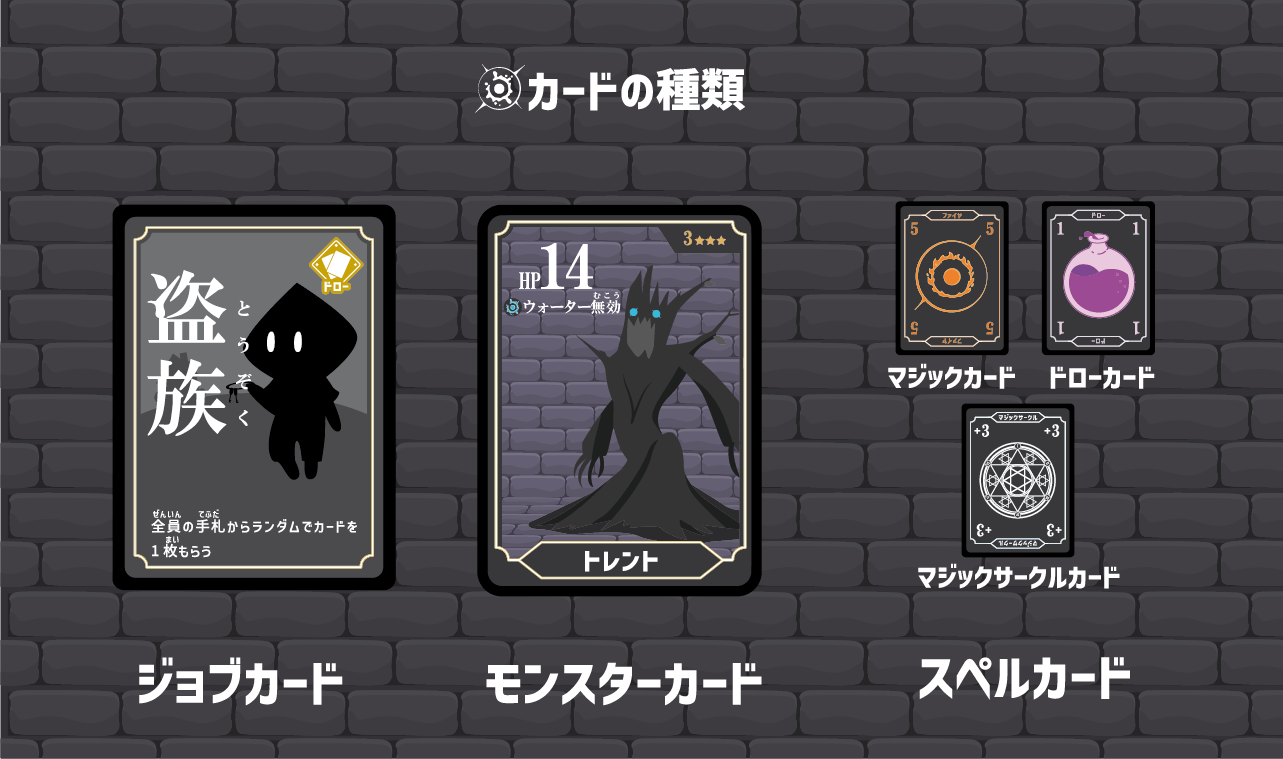 - 各プレイヤーは3種類の魔法カードとジョブカードのスキルを駆使し、場のモンスターへ順番に攻撃をしていき、ダメージを与えて倒していきます。最終的に倒したモンスターが持つ星の数が1番多いプレイヤーが勝者となるバトルゲームです。