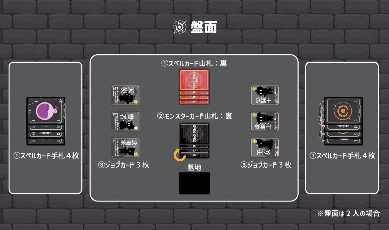 各プレイヤーは3種類のスペルカードとジョブカードのスキルを駆使し、場のモンスターへ順番に攻撃をしていき、ダメージを与えて倒していきます。最終的に倒したモンスターが持つ星の数が1番多いプレイヤーが勝者となるバトルゲームです。