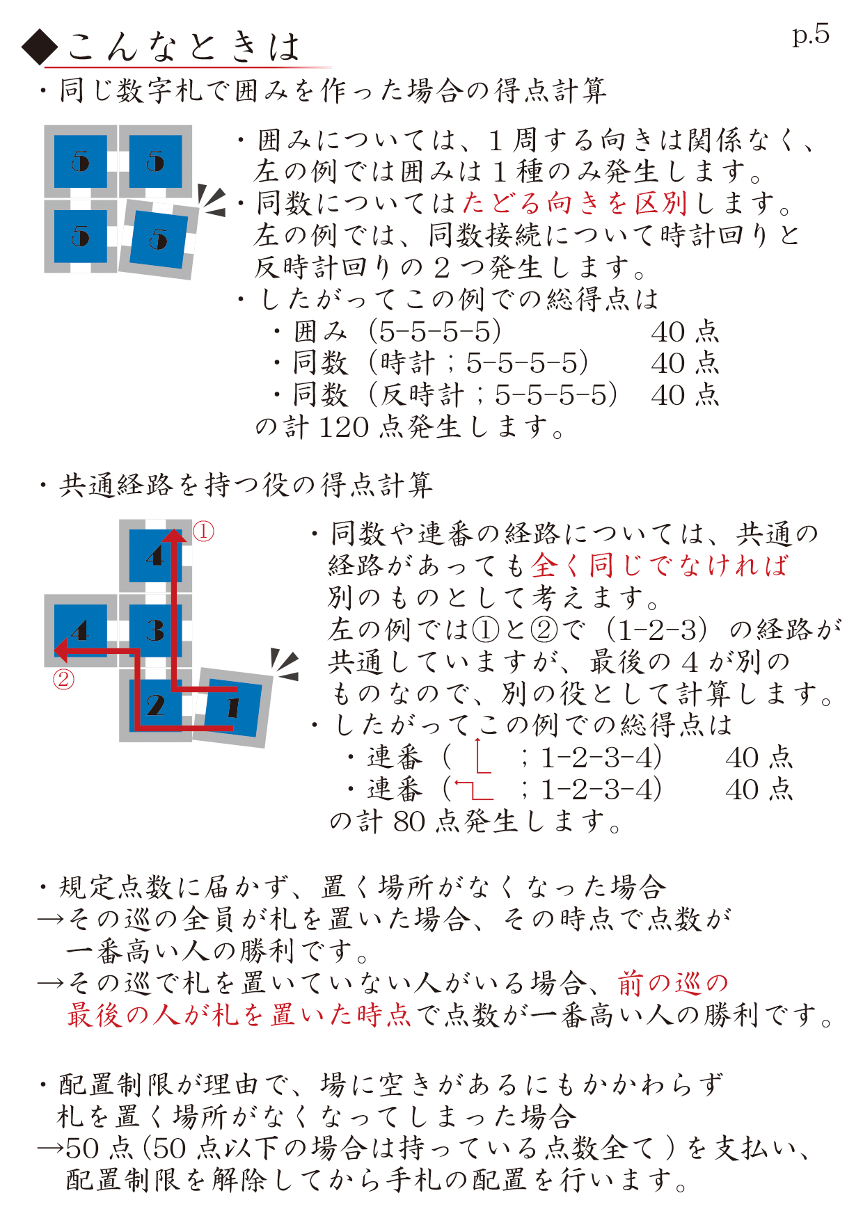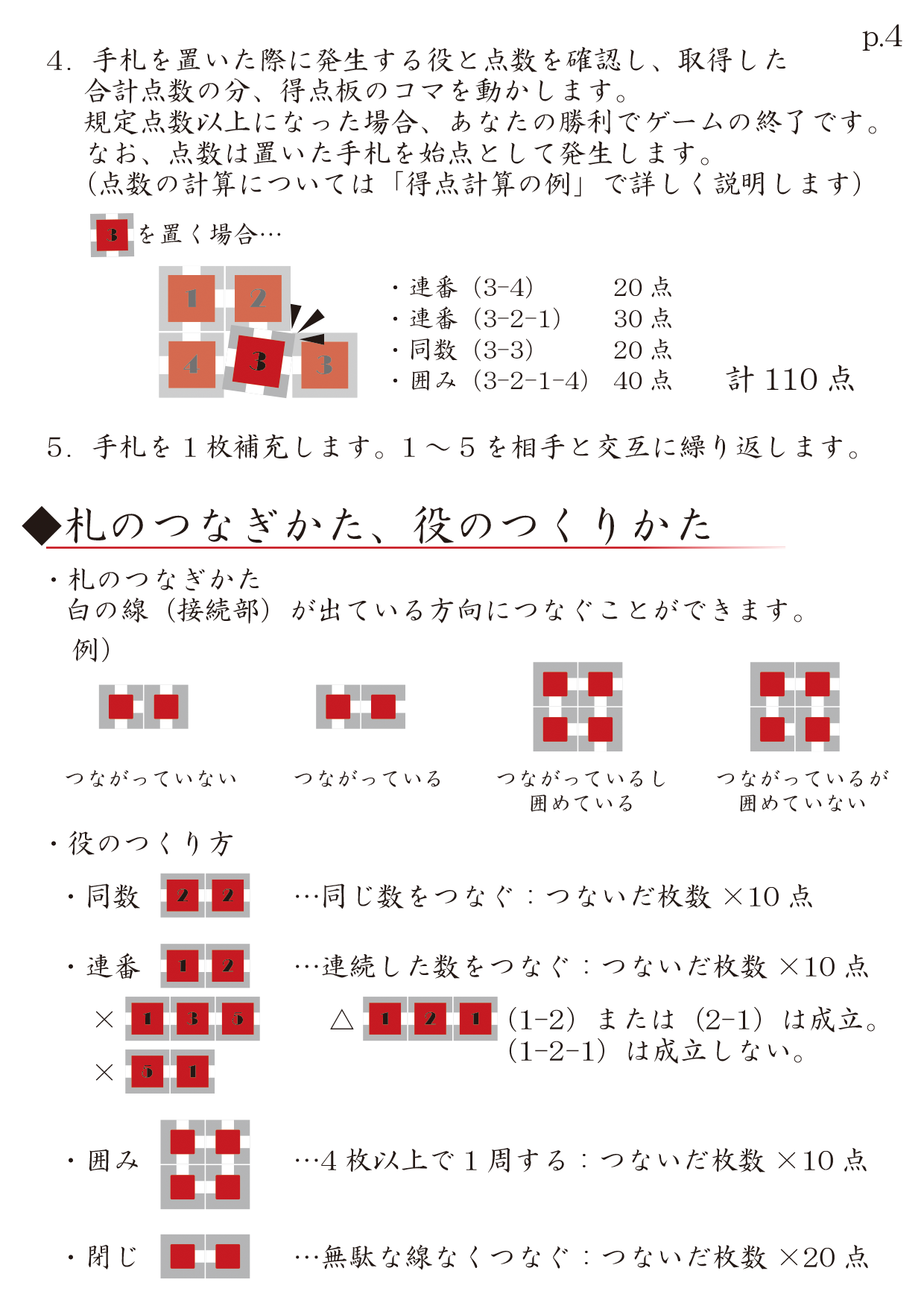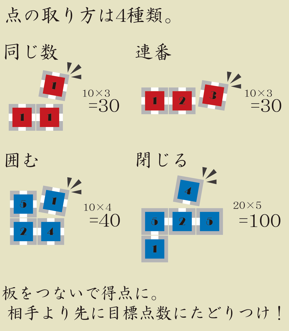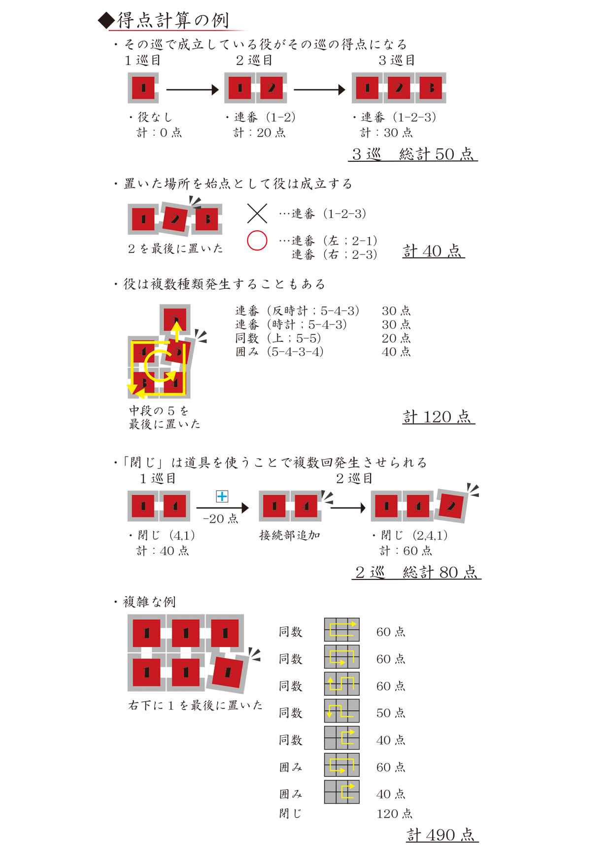 • 「同数」「連番」「囲み」「閉じ」の4つの役を上手に使いこなし、得点を伸ばしていきましょう!