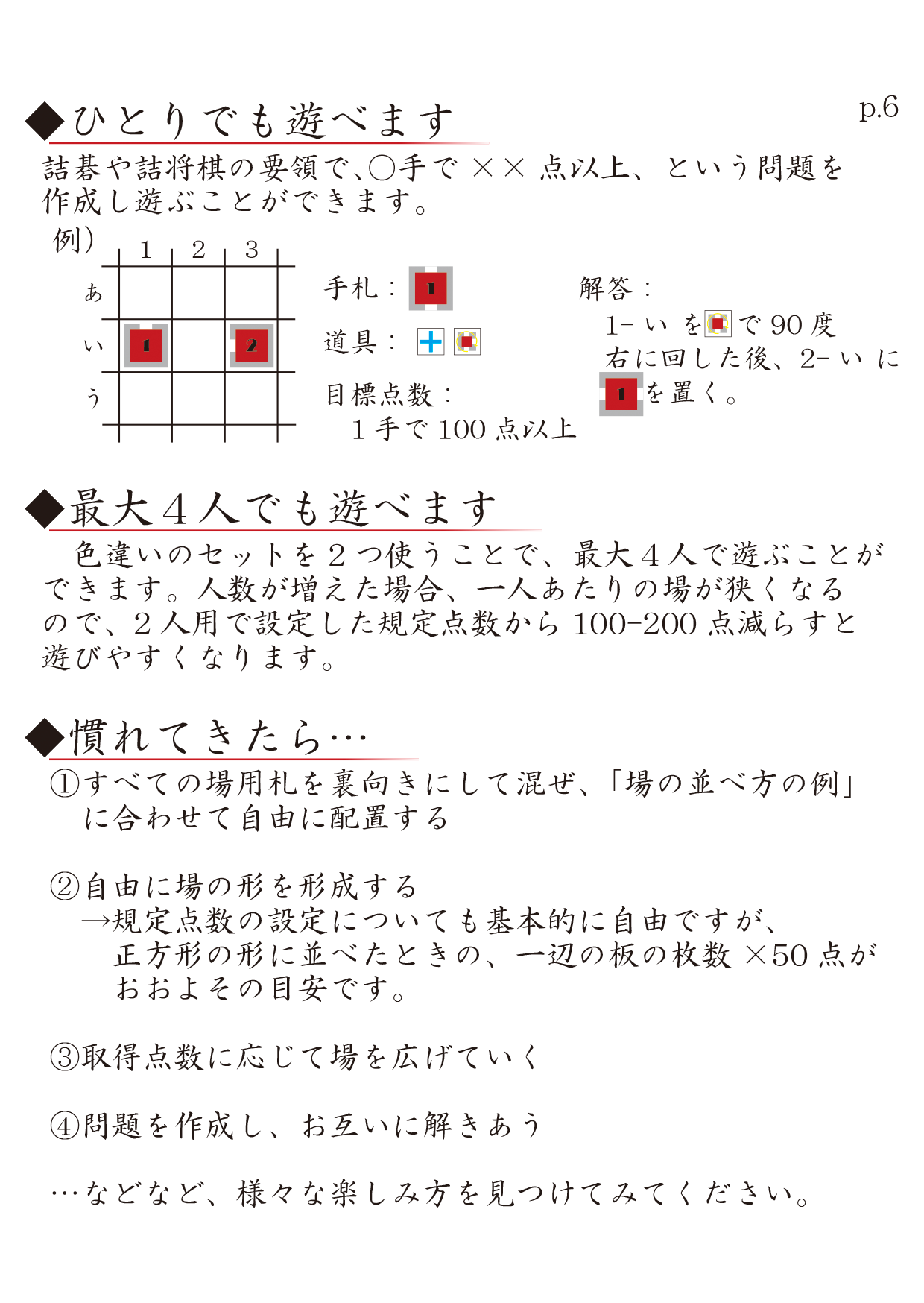 • 詰将棋のように1人でも遊べますし、色違いのセットがあれば最大4人で遊ぶことができます!