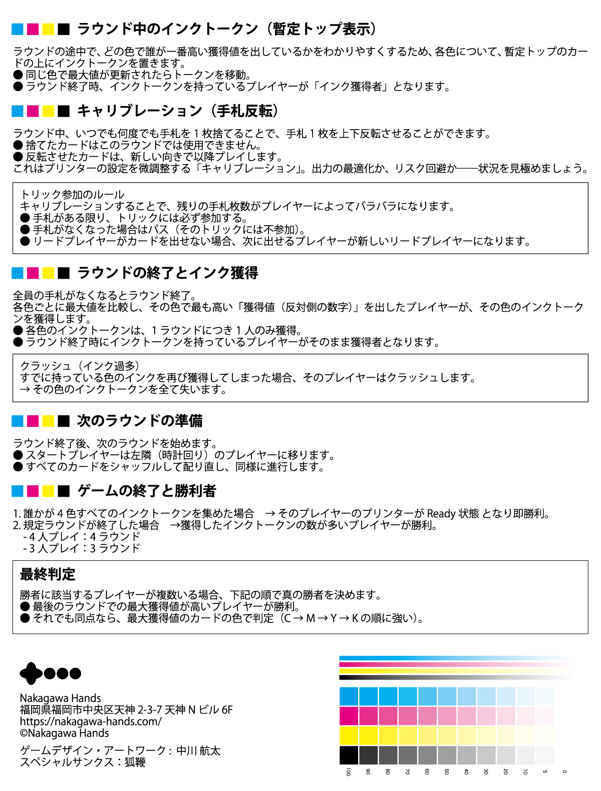 プレイヤーはプリンターとなり、印刷に必要な4色のインク ― C・M・Y・K ― を補充し、完全な出力状態「Ready」を目指します。 しかし、印刷は繊細なシステム。同じ色を入れすぎると、インクはにじみ、プリンターはクラッシュしてしまう。