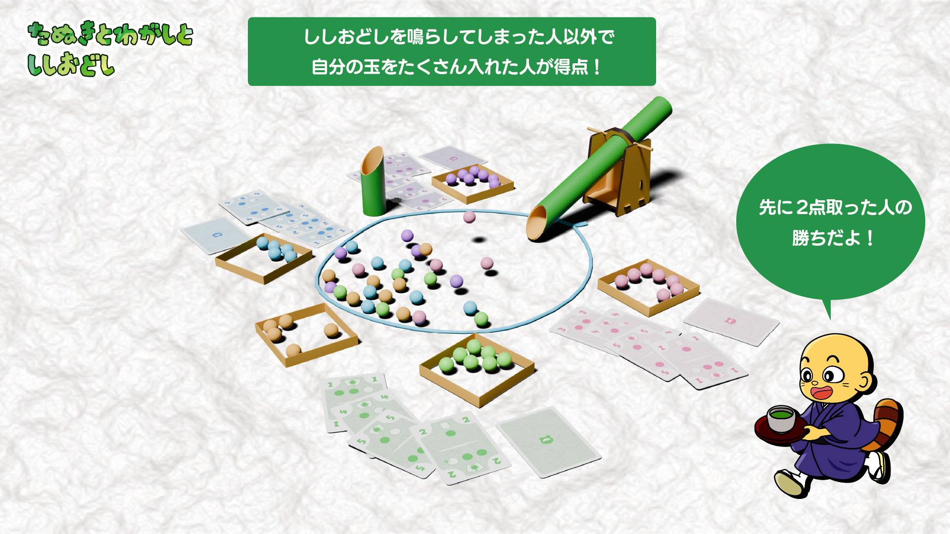 - たくさんわがしをつまみぐいしたいけど、ししおどしが鳴ったらたぬきに戻っちゃうよ!