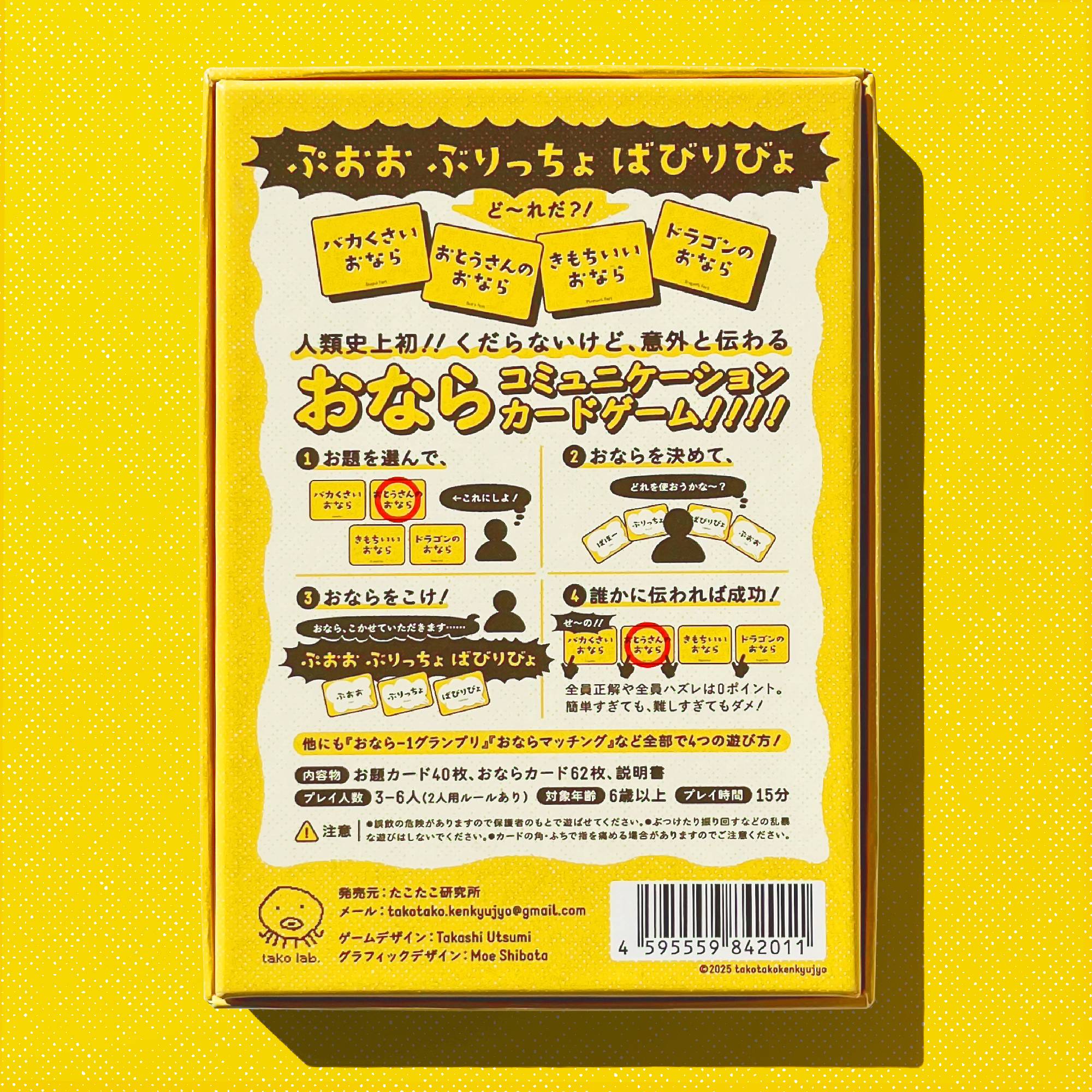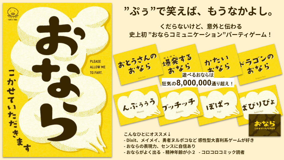 - おならカードの組合せは狂気の800万通り超え!子どもから大人までおならを楽しめます。