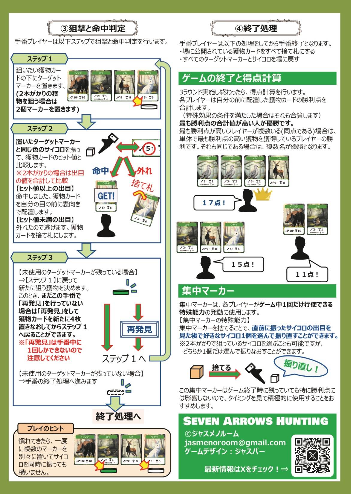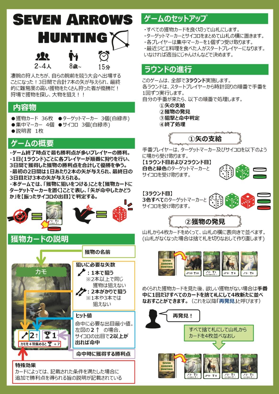 SEVEN ARROWS HUNTINGは、見つけた獲物をダイスを使って狩猟し、高得点を獲得したプレイヤーが優勝する狩猟ゲームです。