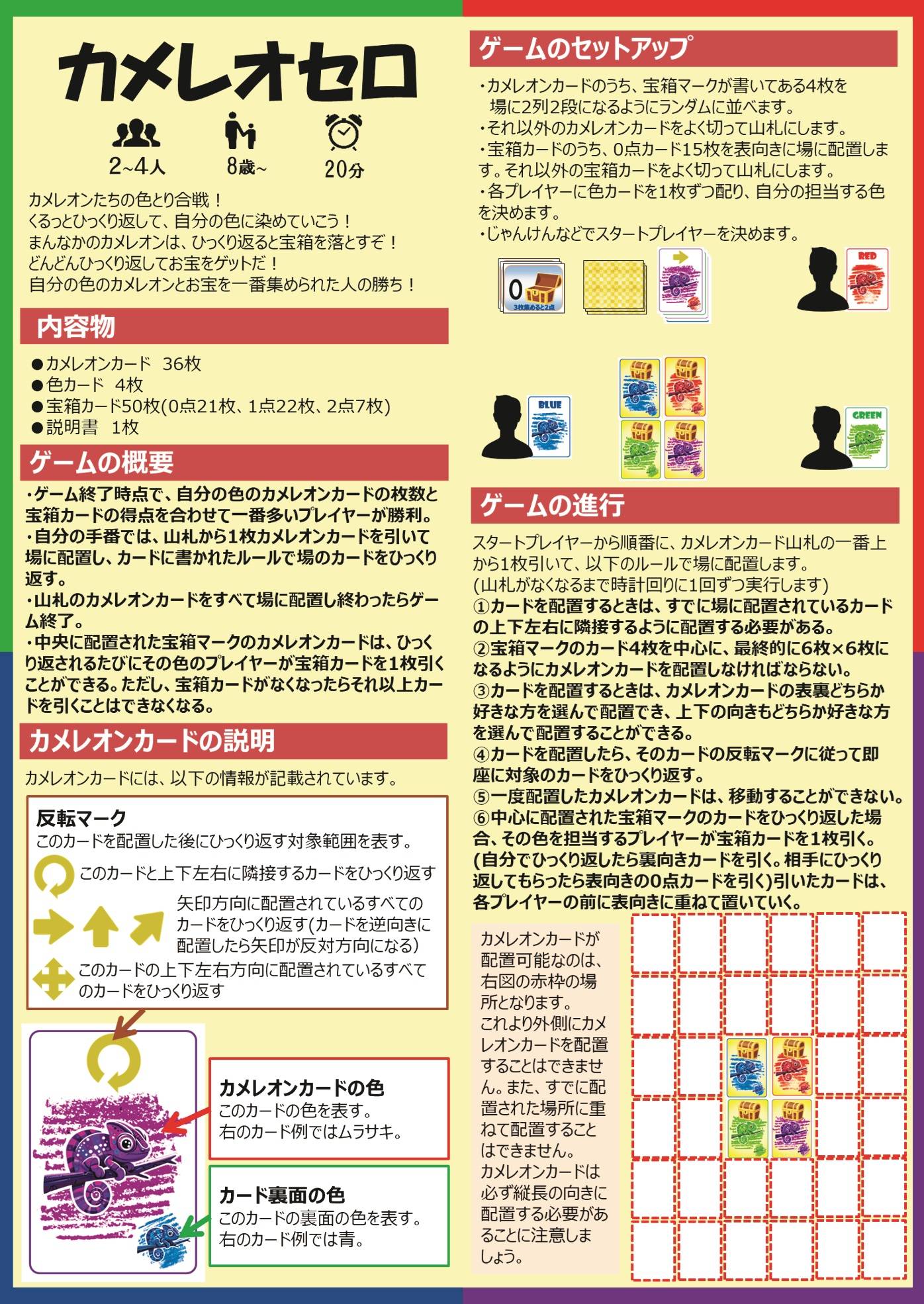 カメレオセロは、場にカメレオンカードを配置していってルール通りに他のカードをひっくり返していき、最終的に自分の色のカメレオンカードが一番多い人が勝ちのゲームです。