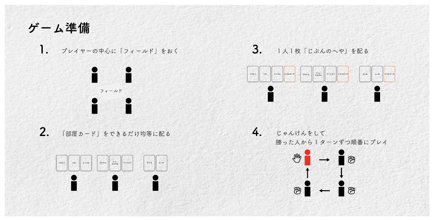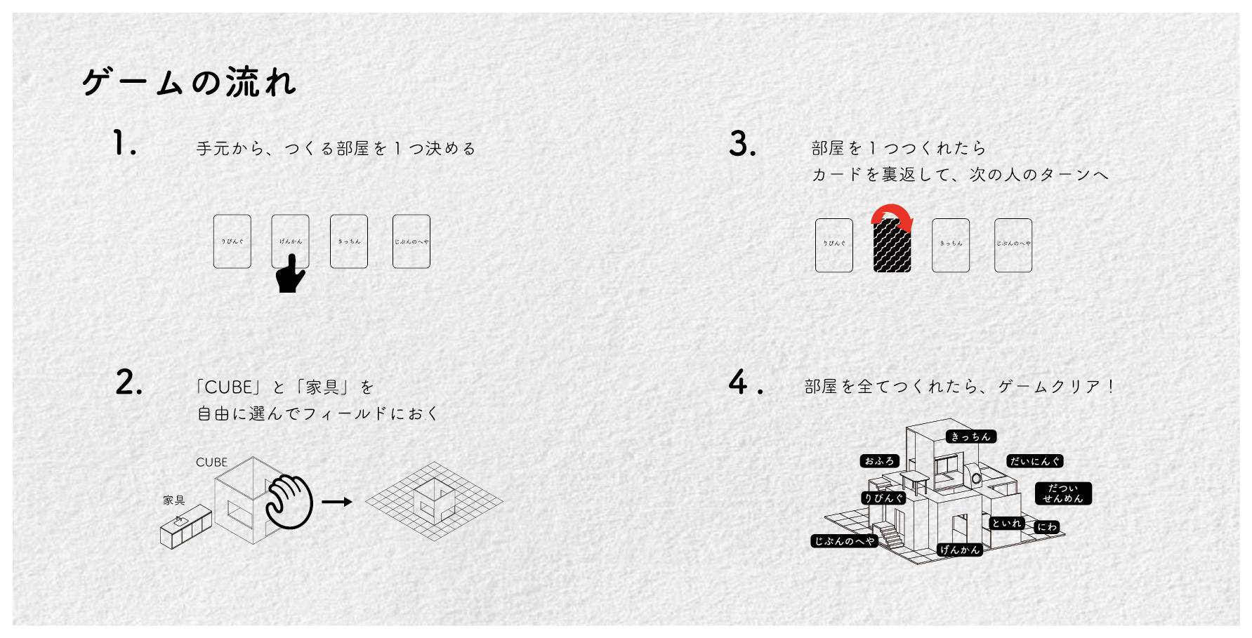 - 配られたカードに書いてある部屋を順番に作っていき、みんなで1つの家を作っていきます。