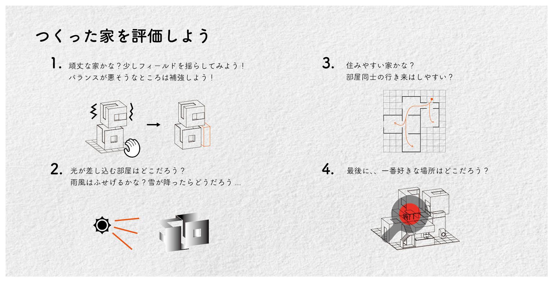- 穴の空いたCUBEの穴を上手くつなげていくことで家が完成するのですが、これがなかなか難しい..。