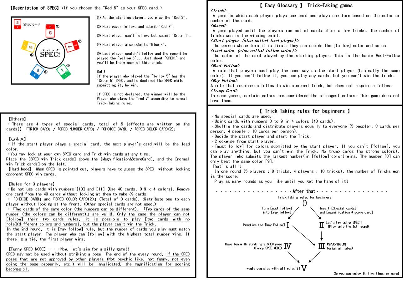 • 自分で決めた伏せカードの色と数字が場に出たら「SPEC!」で勝利