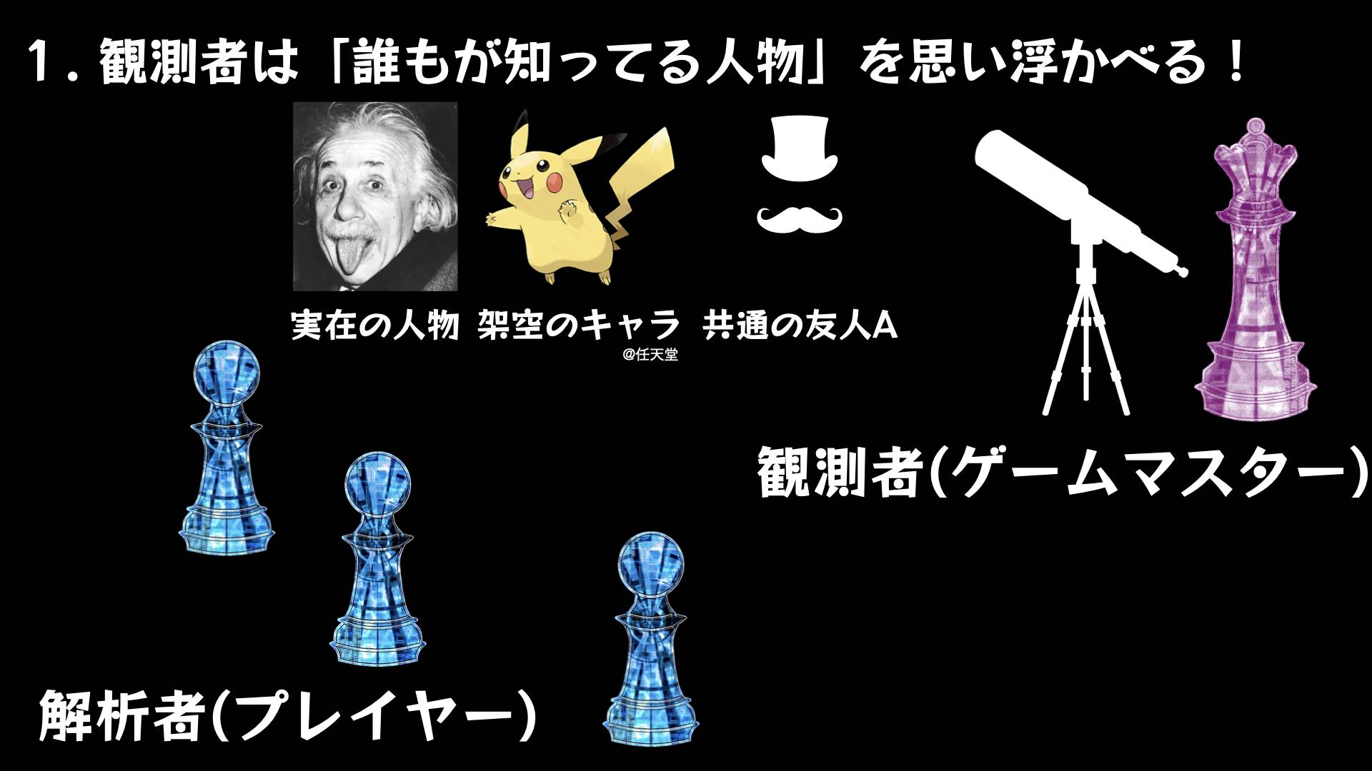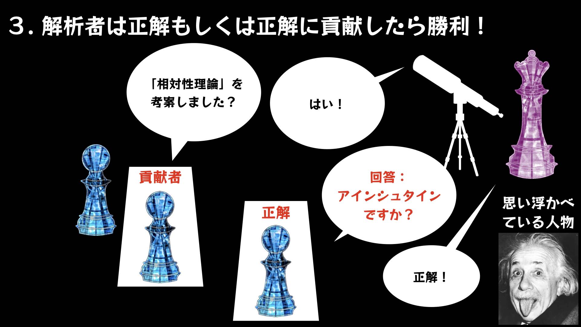 プレイヤーの勝利条件は思い浮かべた人物を当てに行くこと or 人物を解明にするのに最も貢献した行動をすること!