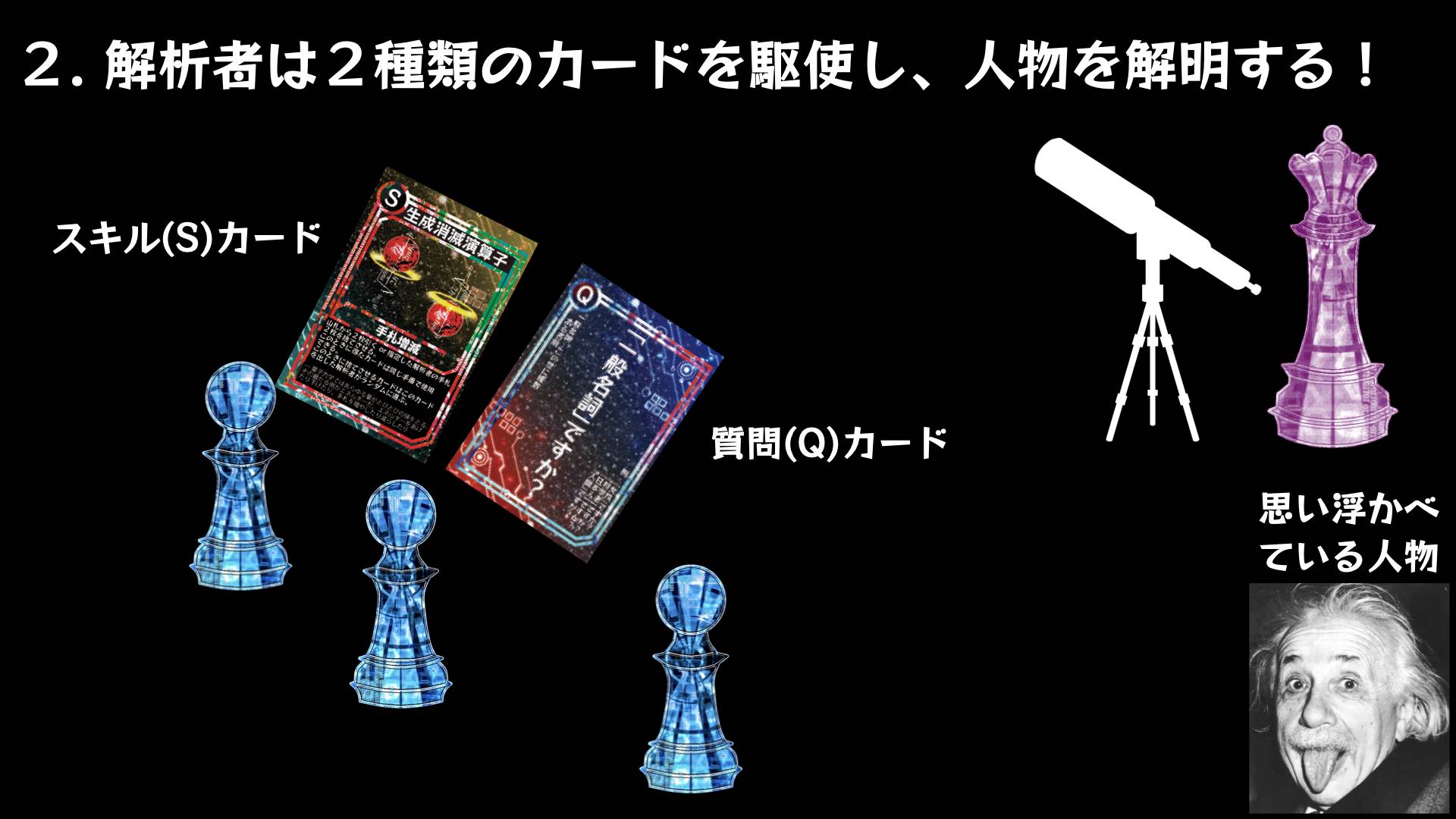 ゲームマスター(観測者)が思い浮かべた人物をプレイヤー(解析者)が物理の知識(スキルカード)と質問(質問カード)を駆使して解明する戦略パーティーカードゲーム!