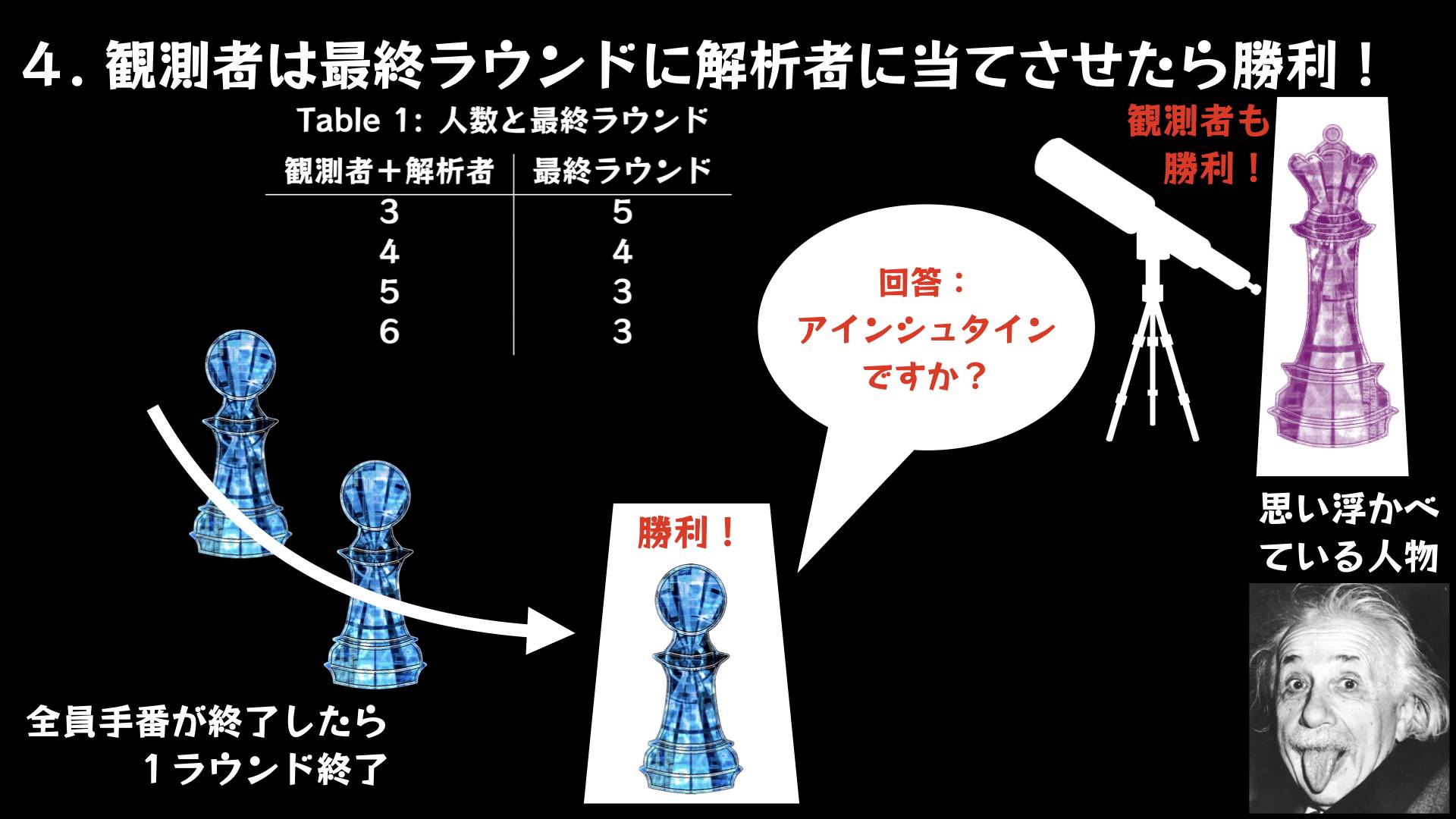 - ゲームマスター(観測者)が思い浮かべた人物をプレイヤー(解析者)が物理の知識(スキルカード)と質問(質問カード)を駆使して解明する"戦略パーティーカードゲーム"