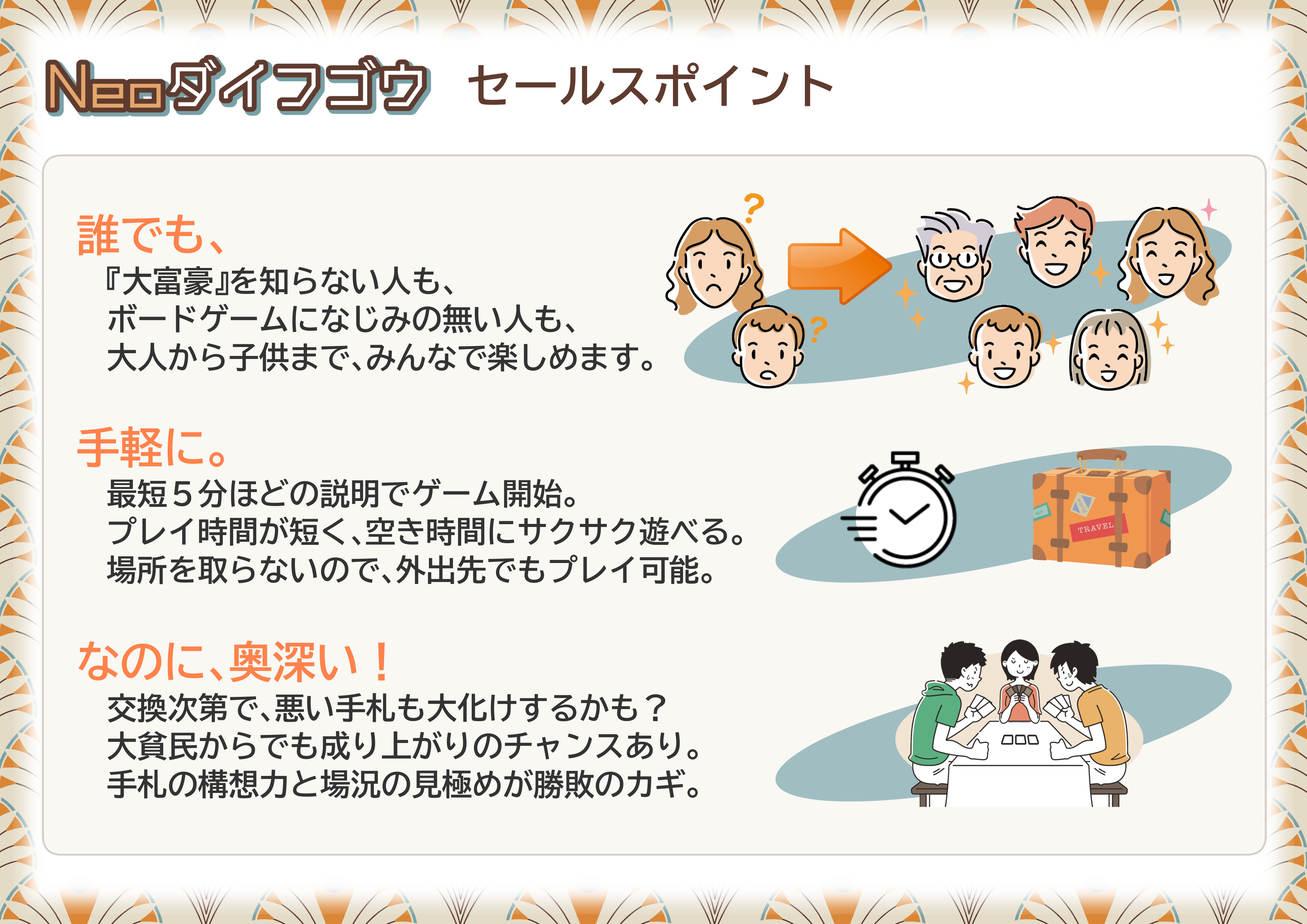 - 手軽に楽しめる『大富豪』の良さを保ちつつ、ドラフト要素などの戦略性を高めています。