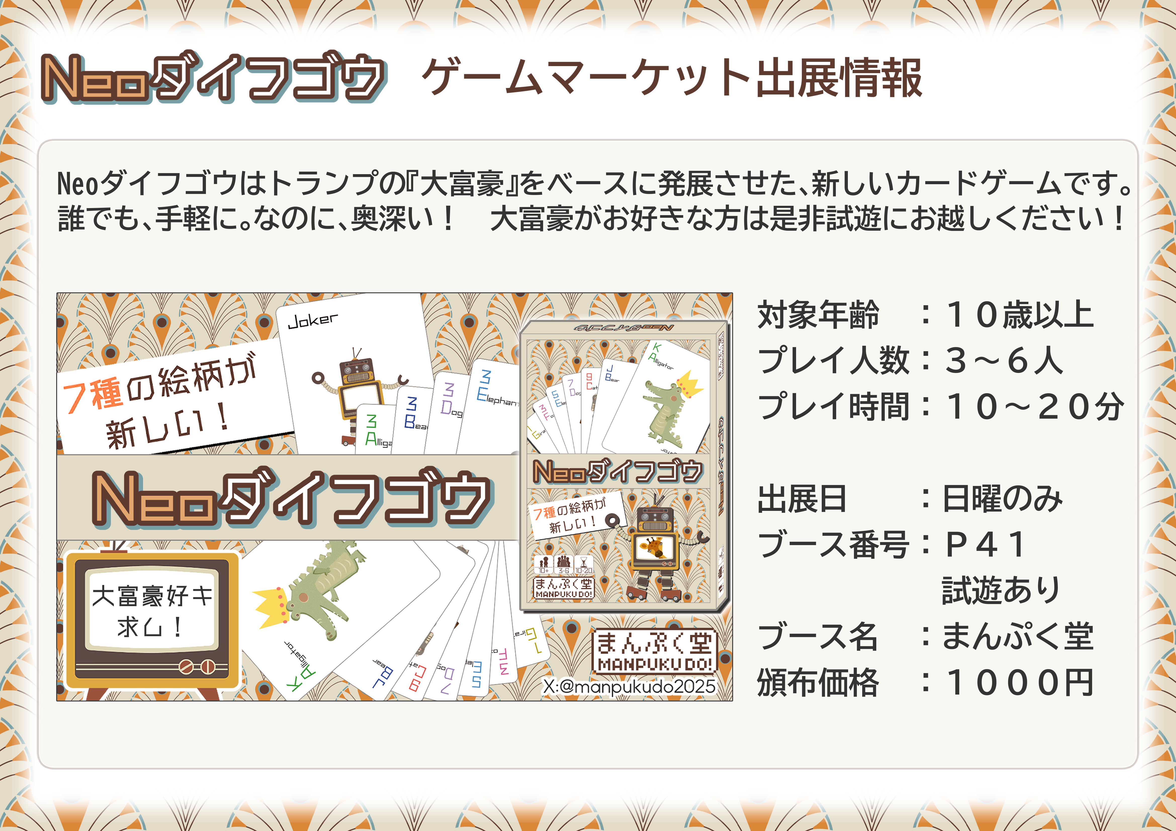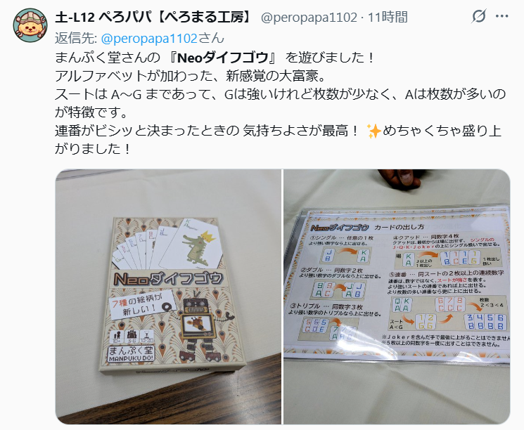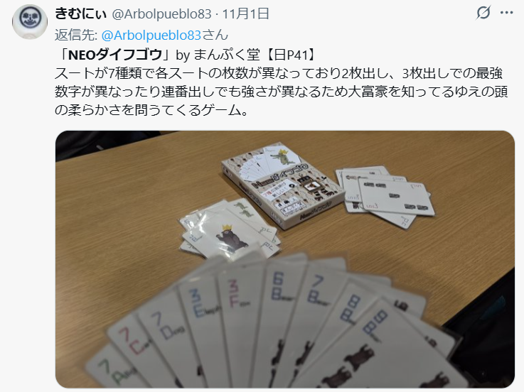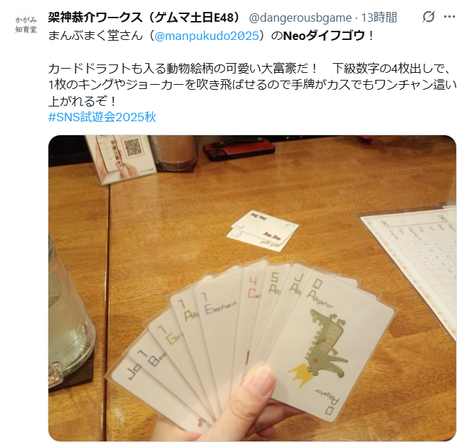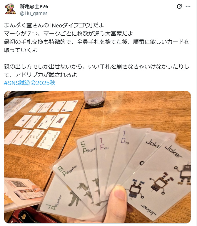 11/01(土) #ボドちゃ 09:40- 幡ヶ谷区民会館11/02(日) 参加者試遊会 18:00- ジェリカフェ渋谷宮益坂店11/05(水) #sns試遊会2025秋 17:30- 有明亭 11/15(土) EJPボドゲ相互PR会 18:00- すみだ産業会館11/16(日) さいゲムマ相互試遊PR会 13:00- てくのかわさき5階