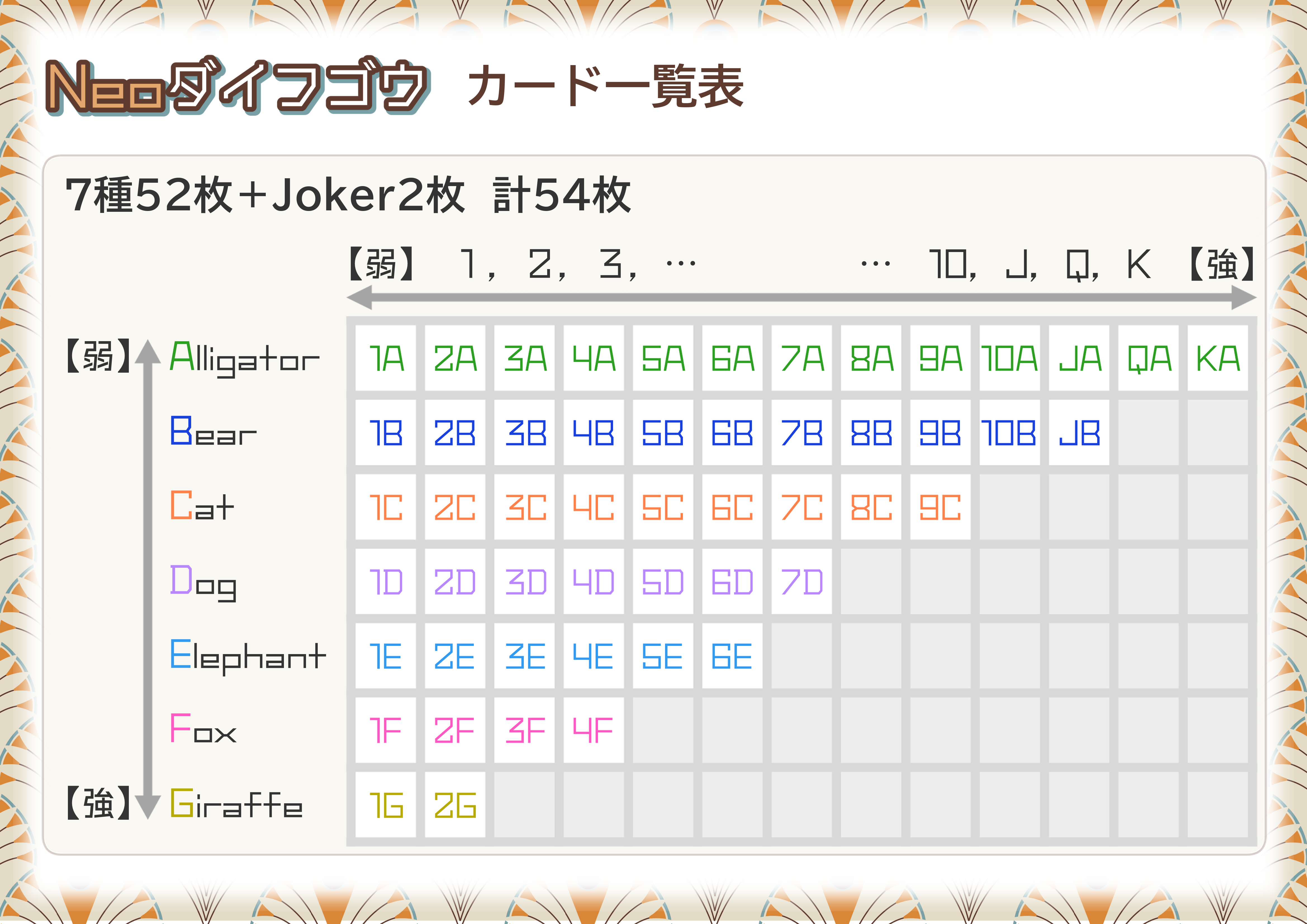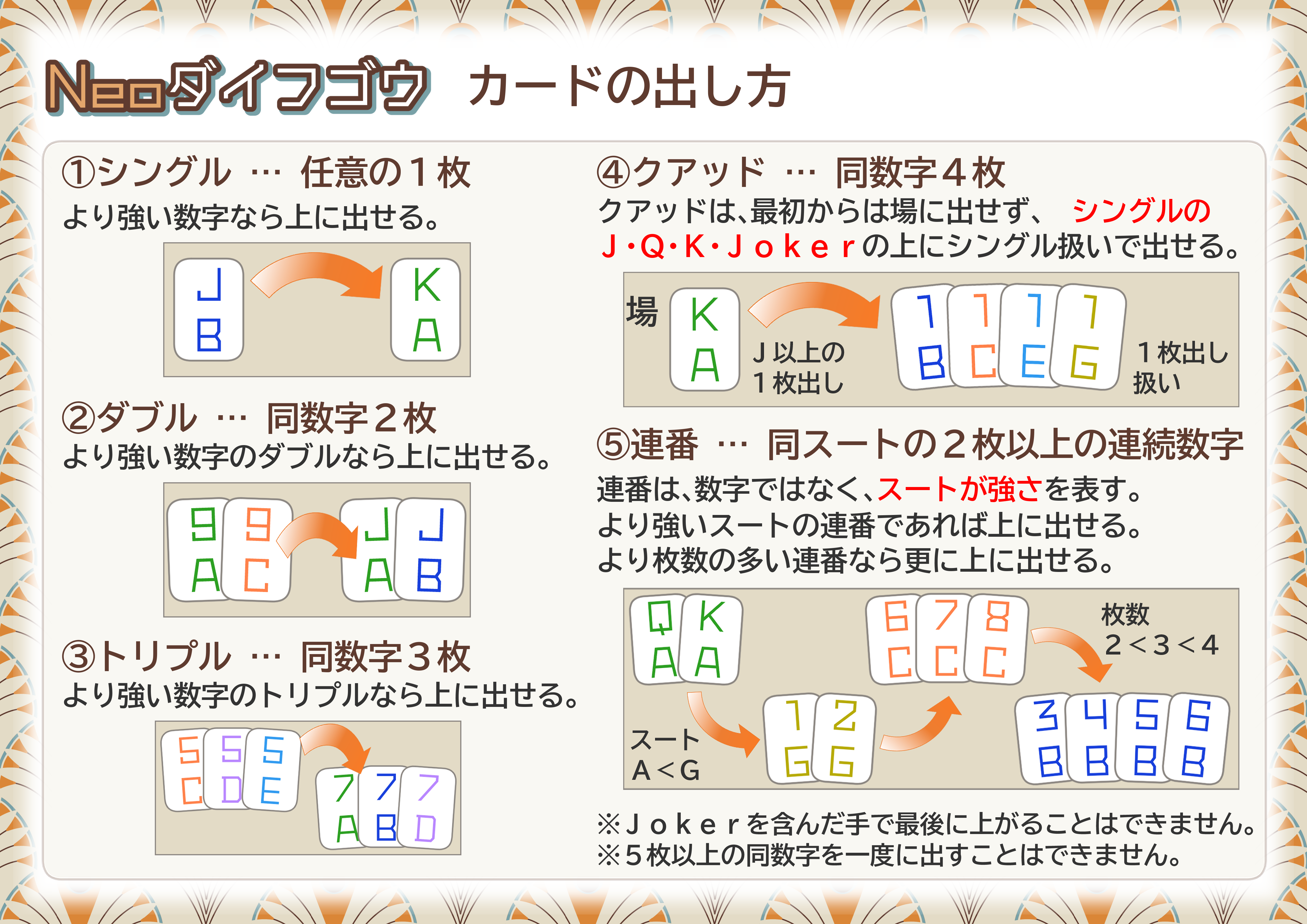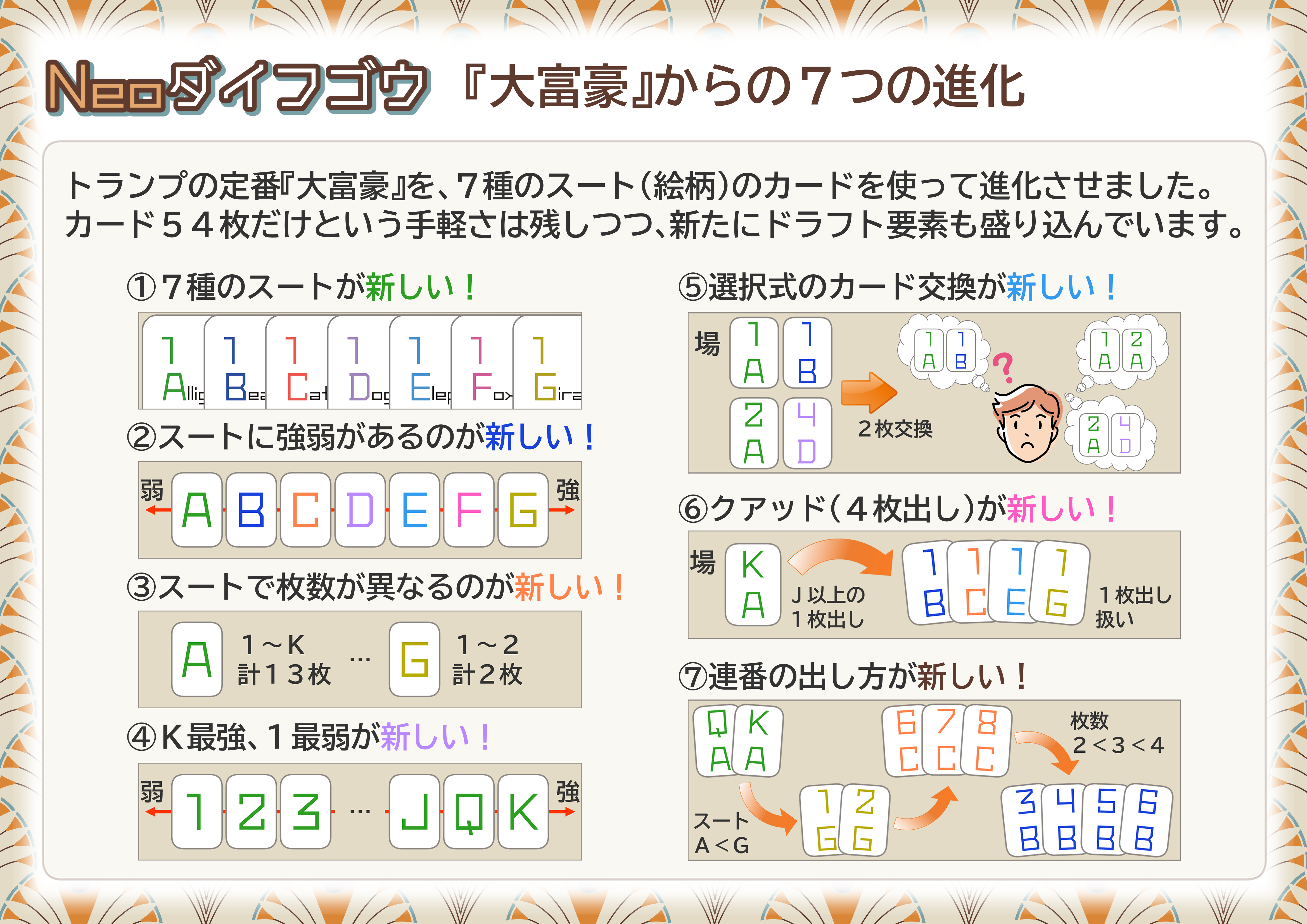 - トランプの定番『大富豪』を、7種のスート(絵柄)のカードを使って進化させました。