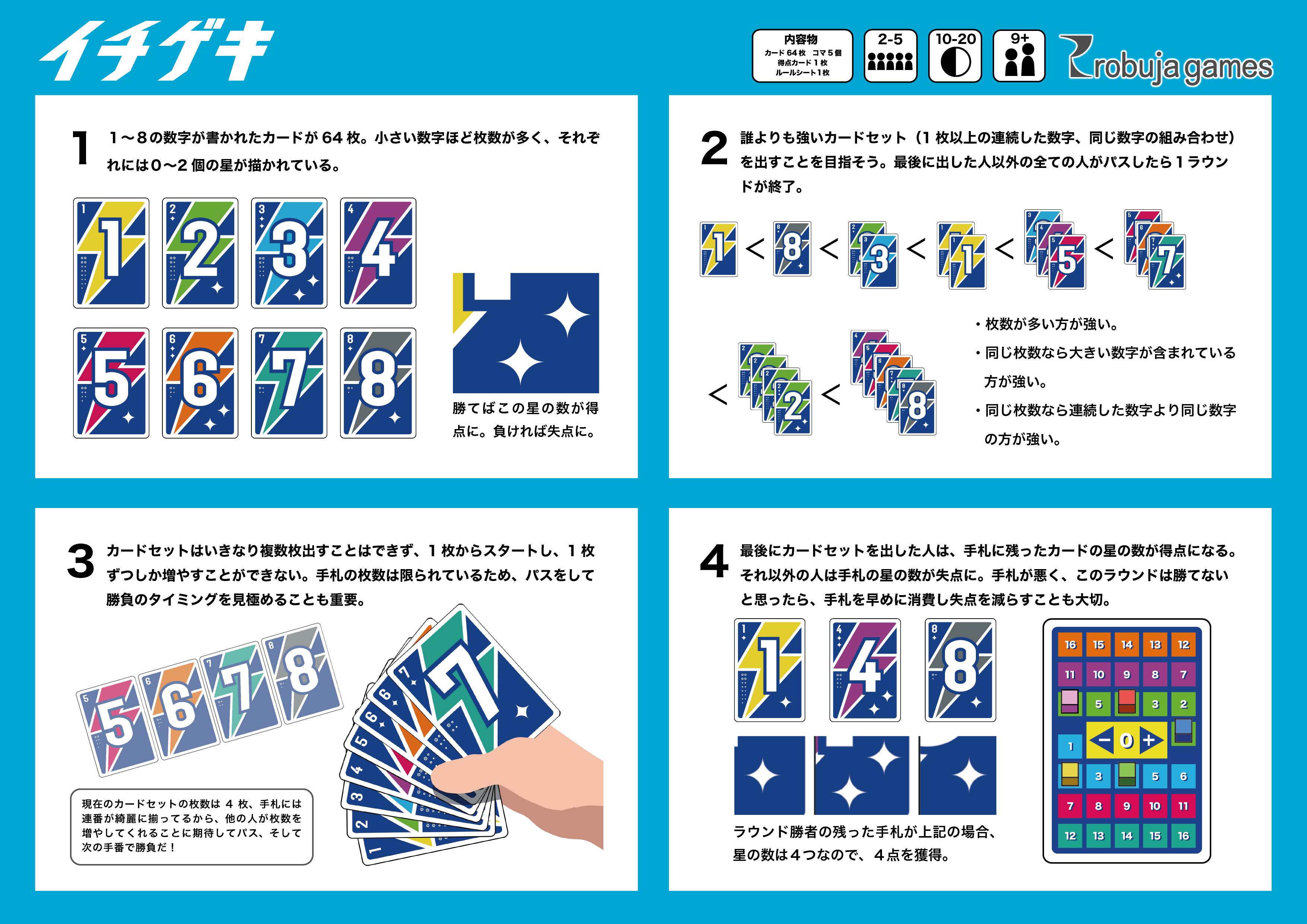 1〜8の数字カード計64枚。同じ数字、または連番をより多く、最後に出せたものが勝者。