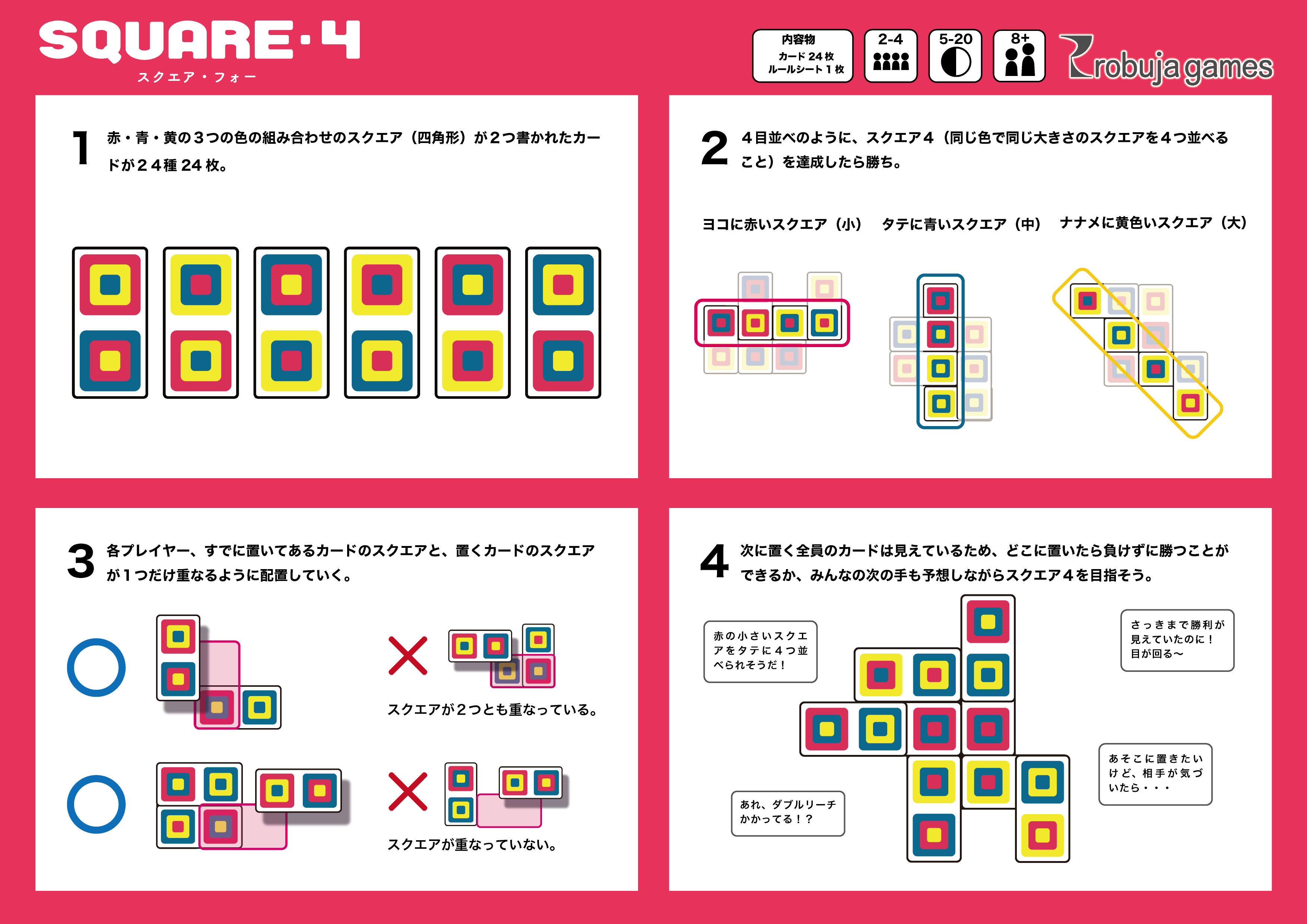2つのスクエアのうち1つが重なるようにカードを配置していき、同じ大きさ同じ色のスクエアをタテ、ヨコ、ナナメ、いずれかに4つ並べたら勝ち。