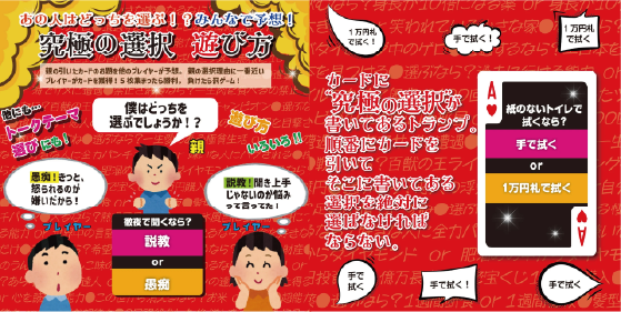 親はカードを引きお題を読み上げる。他のプレイヤーは親がどちらを選択するか予想し、理由まで述べる。最後に親は答えを公開し、親の答えと理由に一番近かったプレイヤーはカードを獲得。5枚先取で負けた人は罰ゲームカードを引き、罰ゲームを実行☆