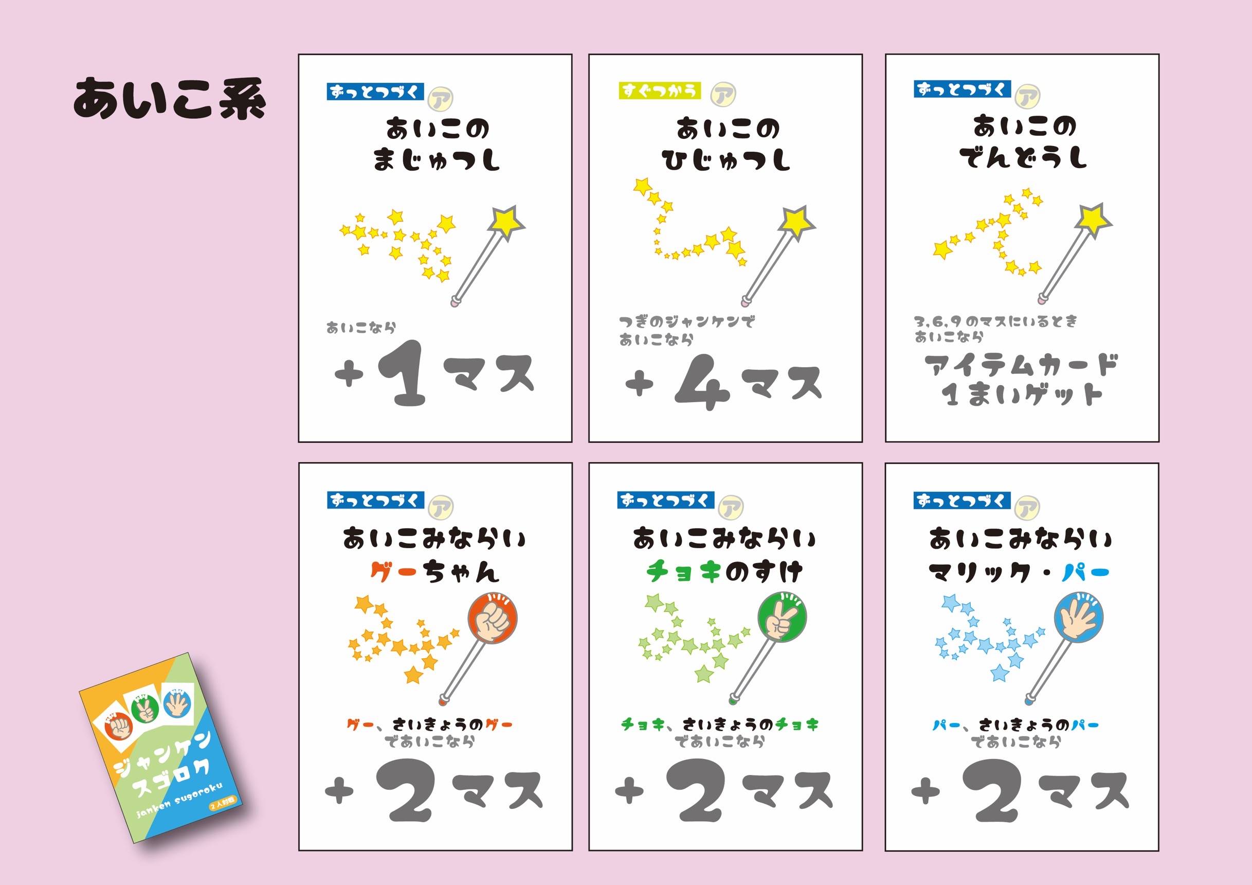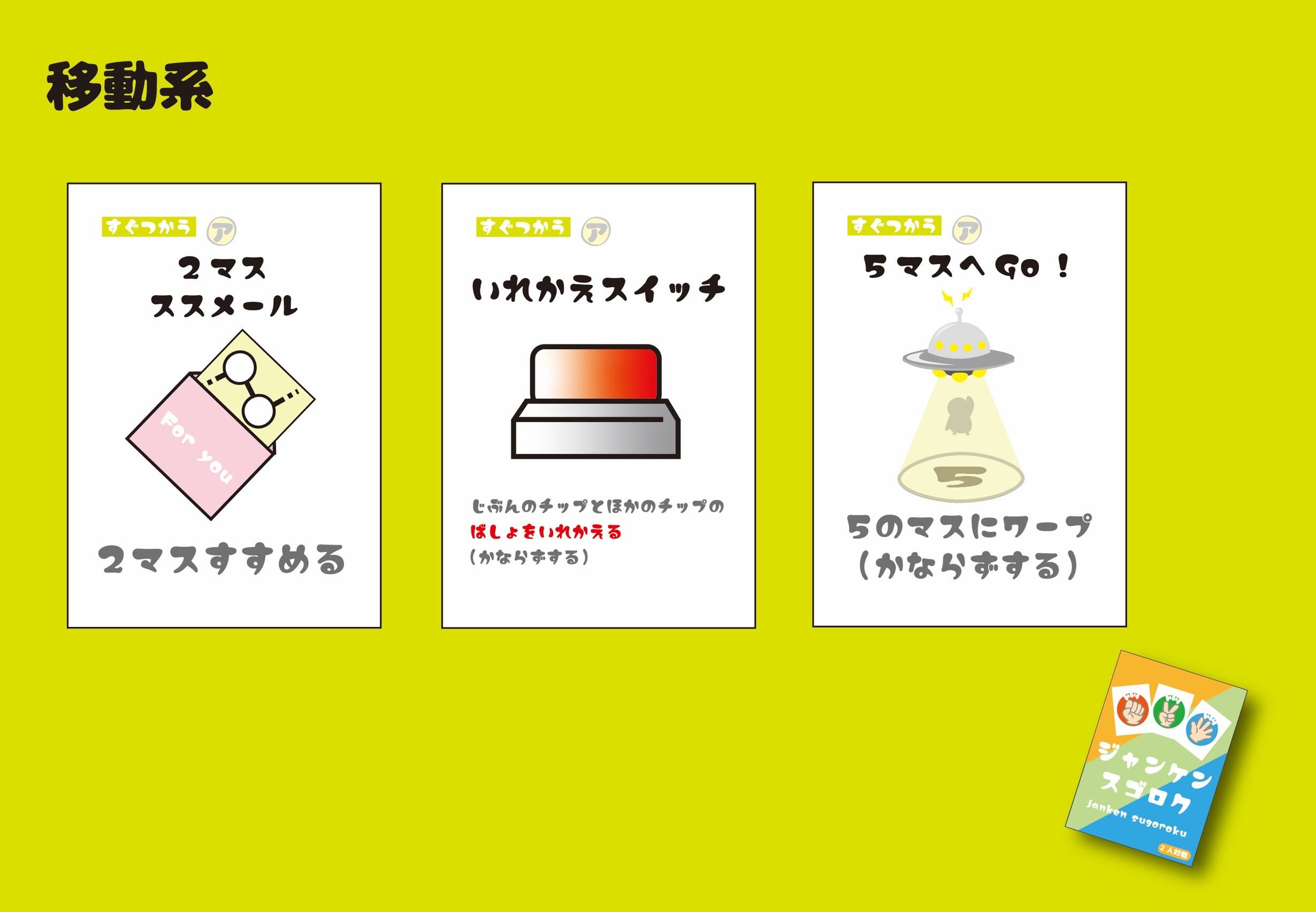 ゲームの途中でゲットできるアイテムカードは全20種類。勝ったら7マス進めるカードやチョキで勝つと追加で3マス進めるカードなど、ゲットしたアイテムカードをうまく使って相手を出し抜こう!