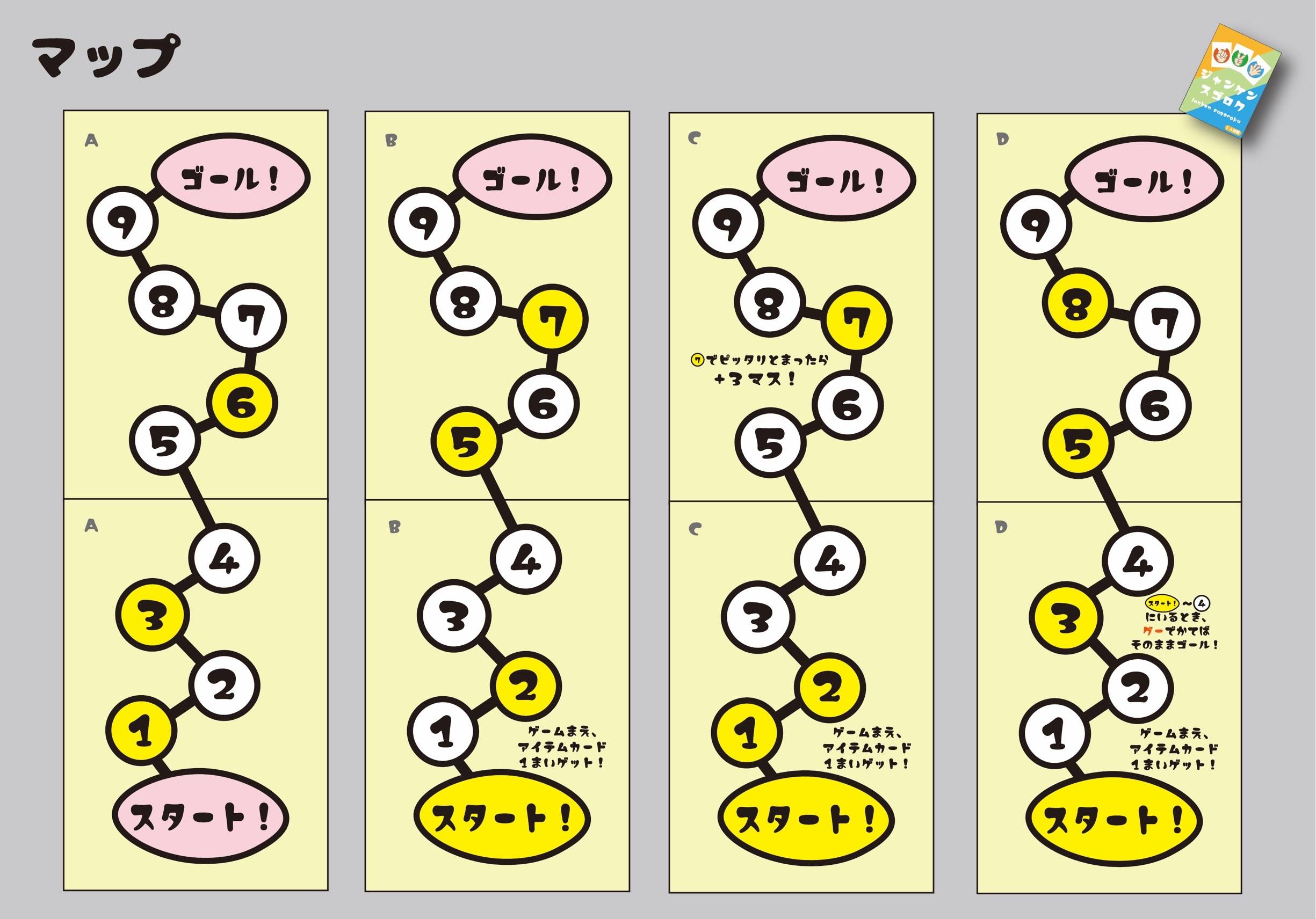 マップはABCDの4種類!アイテムカードをゲットできる回数が変わったりマップ固有の効果があったりするよ。慣れてきたらAとDを組み合わせてみたりしてオリジナルマップを作って遊んでみよう!