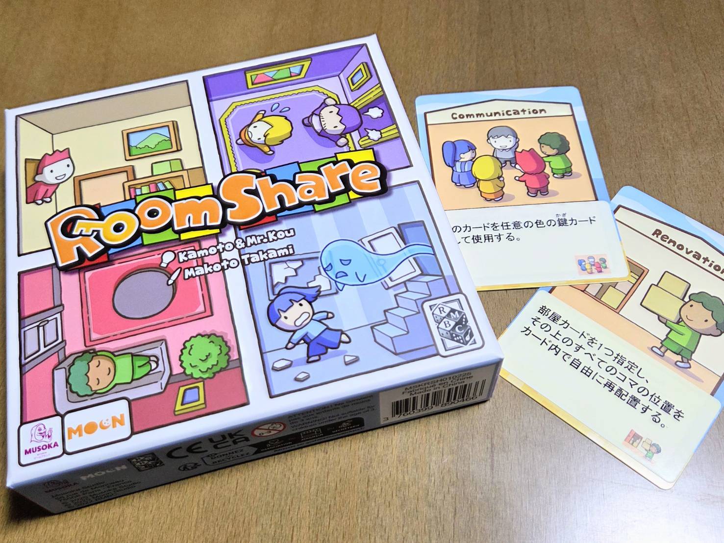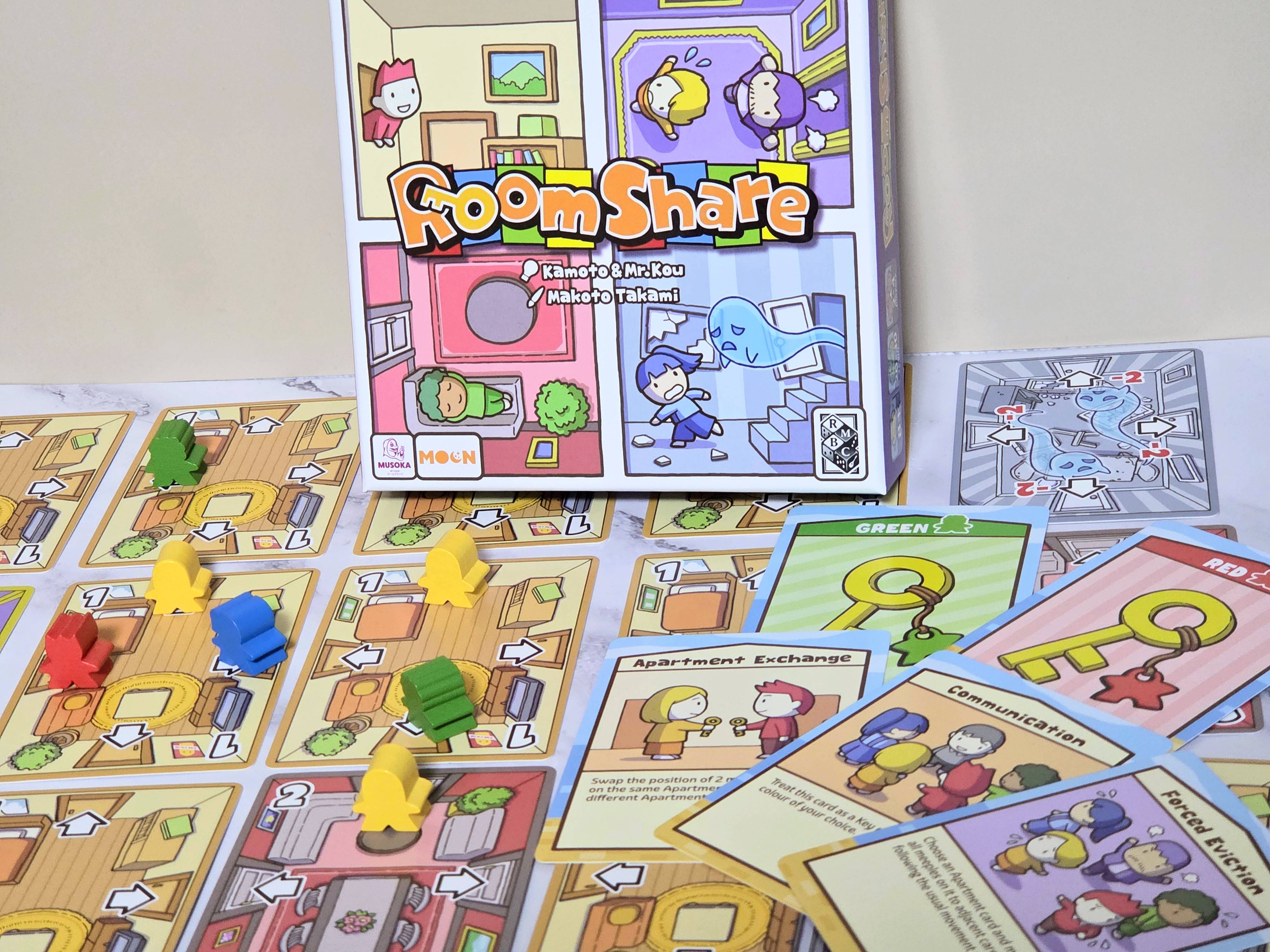 - [新しいアートワーク]、[オリジナル木ゴマ]、[新規カードが2種類追加]と日本語版からさらに豪華になった『ルームシェア』をお楽しみいただけます!