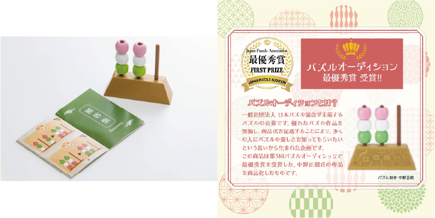 3色のだんごを1つずつ動かして決められた並びに移しかえるパズル!ストンと落ちる感覚がくせになる、インテリアにもおすすめな、かわいいだんごのパズルです。