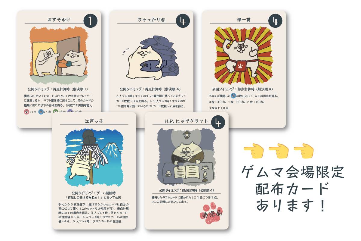 「無垢なるネコは救われる」は、お布施をすることで神様からのギフトを授かり、ギフトの組み合わせで得られる「しあわせポイント」を競うゲームです。
