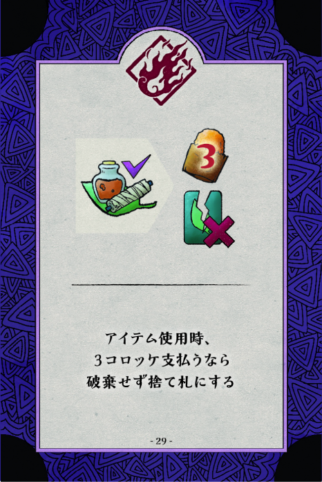 移動中、もしくは移動後にSTARTマスを通過するか止まった場合、これまでにあなたが達成している巻物カードの数に等しいコロッケを即座に得ます。