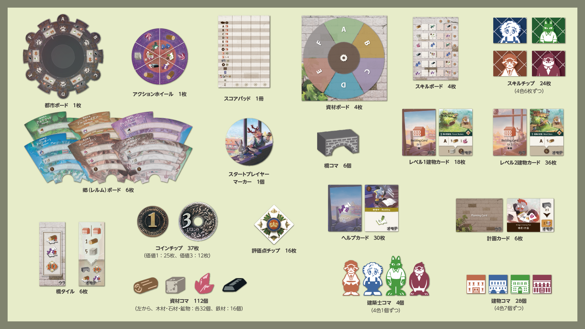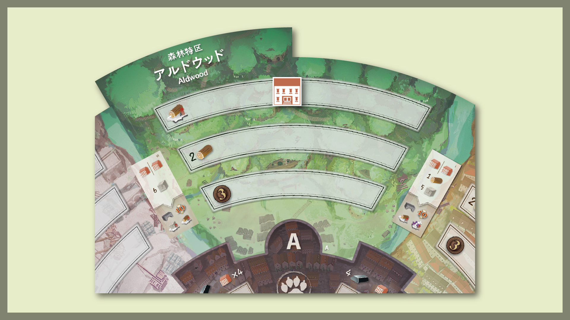 各プレイヤーは、テーブル中央に置かれた「組み合わせボード」に自分の建物コマを配置していきます。