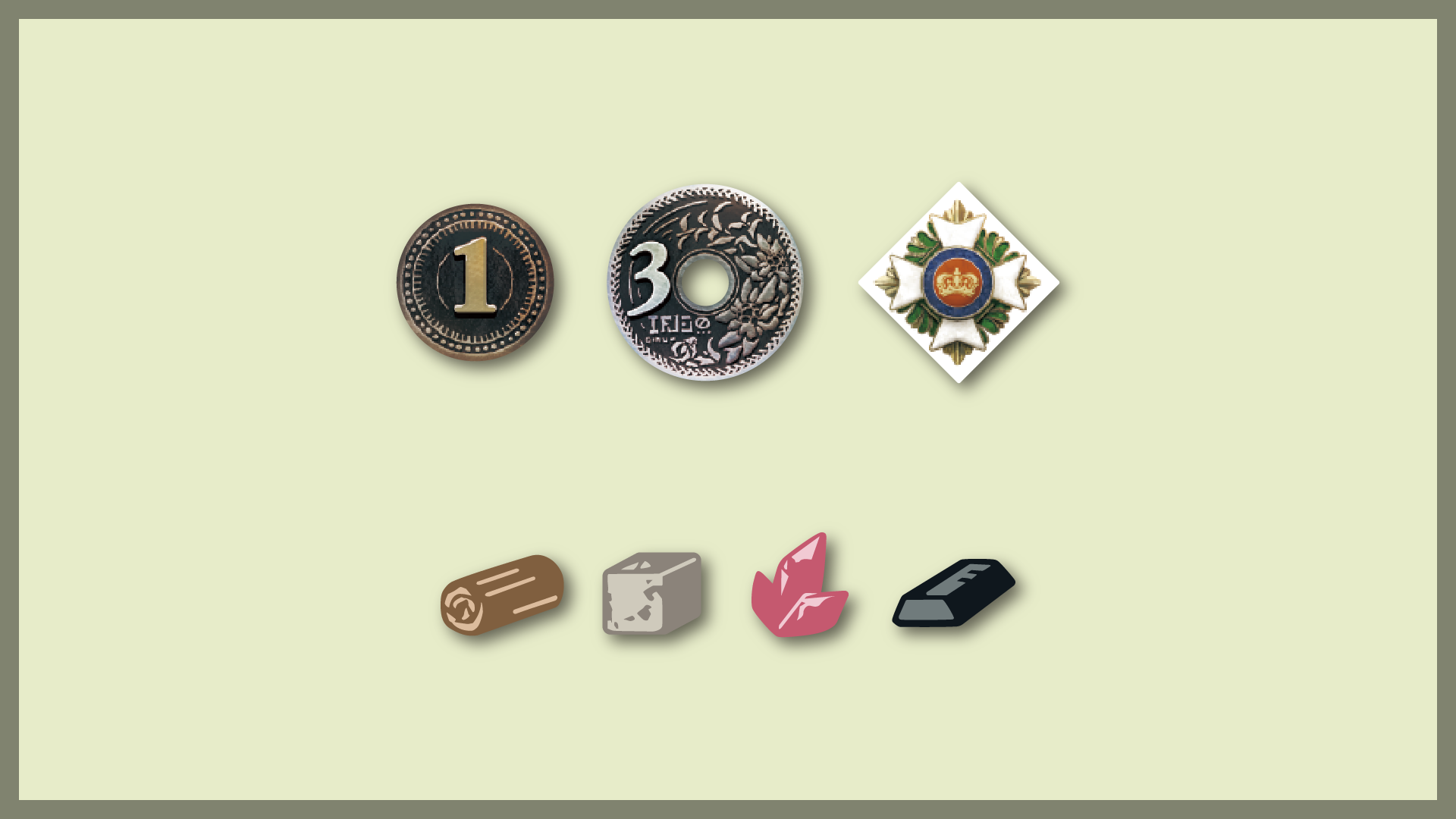 このゲームには「4種類の資材」と「お金」「評価点」が登場します。