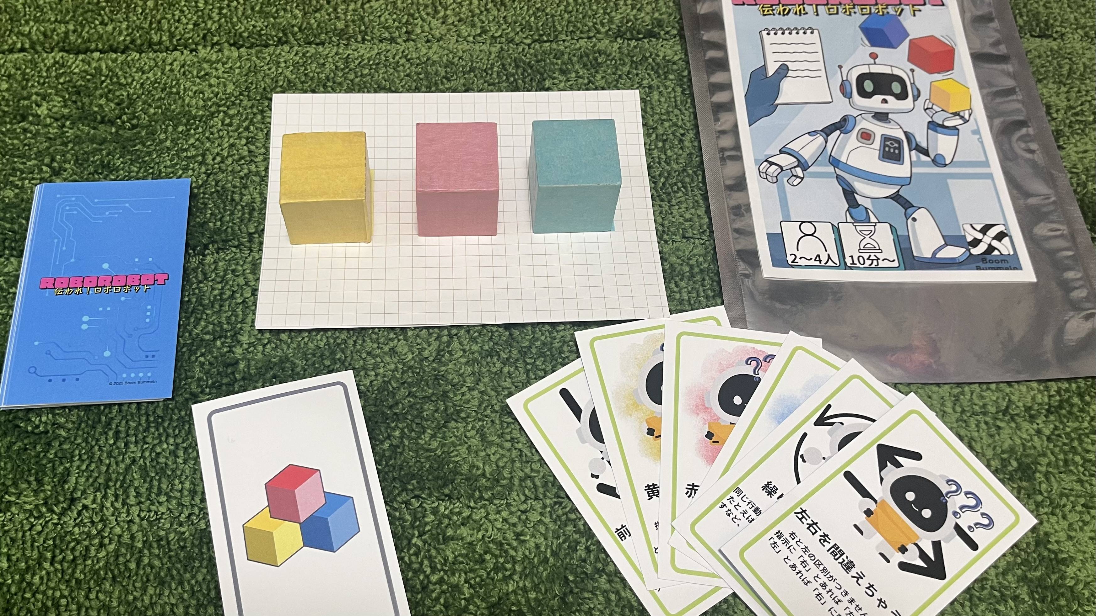 プレイヤーは3つのキューブ(赤🟥・青🟦・黄🟨)を使って、お題の形を作るようロボット役に指示を出します。