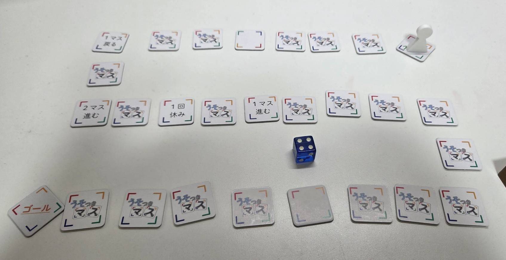 なお、必ず嘘をつかなければならない「うそつきマス」(画像のとおり何も書かれていないマス)がありますので、要注意…