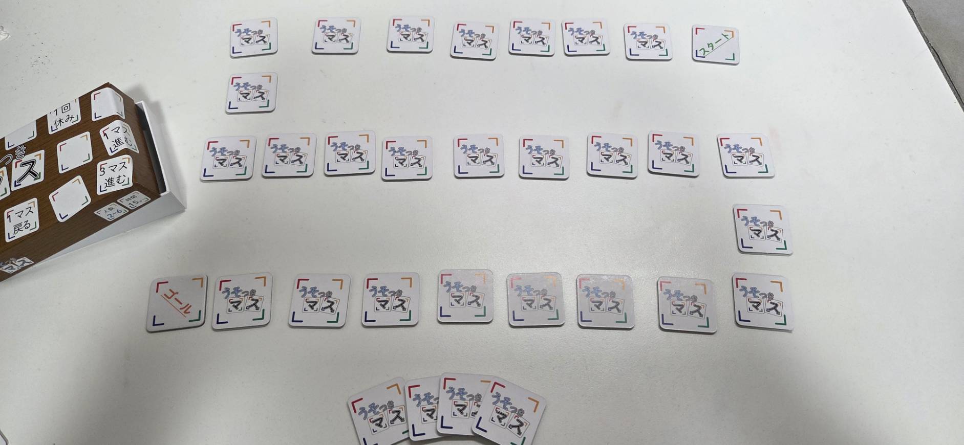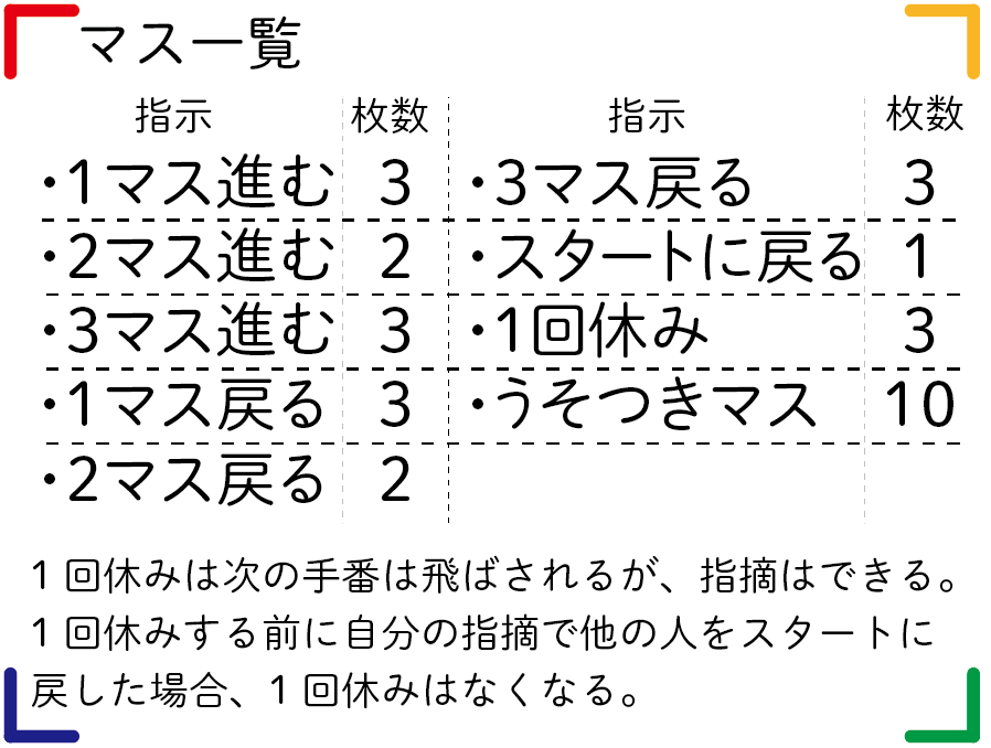 マスの内訳は画像のとおり、割と、「うそつきマス」が多めに入っていますが、実は最初に4枚(2人の時は8枚)ランダム抜くので何が入っているか多少はわからないようになっています。