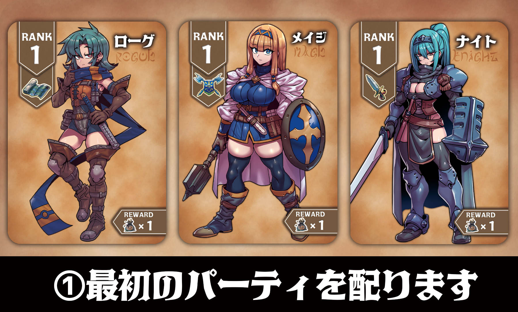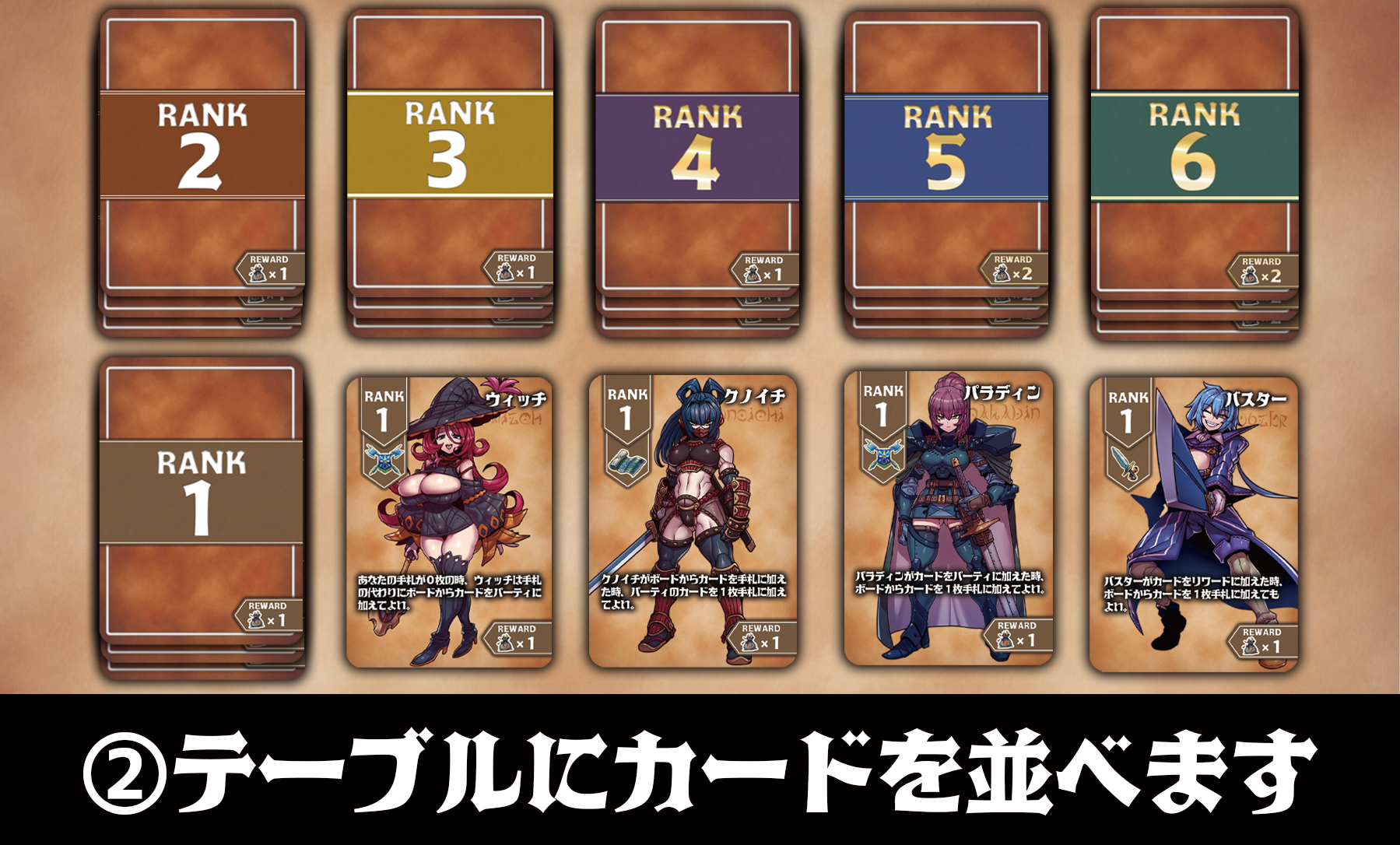 ①このゲームではまず、最初のパーティ「ローグ」「メイジ」「ナイト」の3枚が配られます。