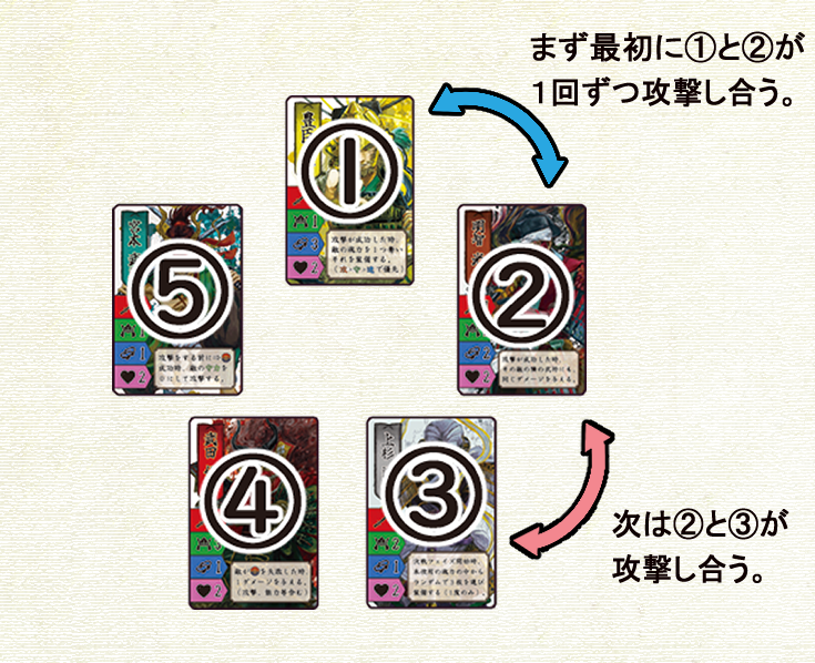 戦闘は、五角形の隣り合う武将同士が順番に戦います。