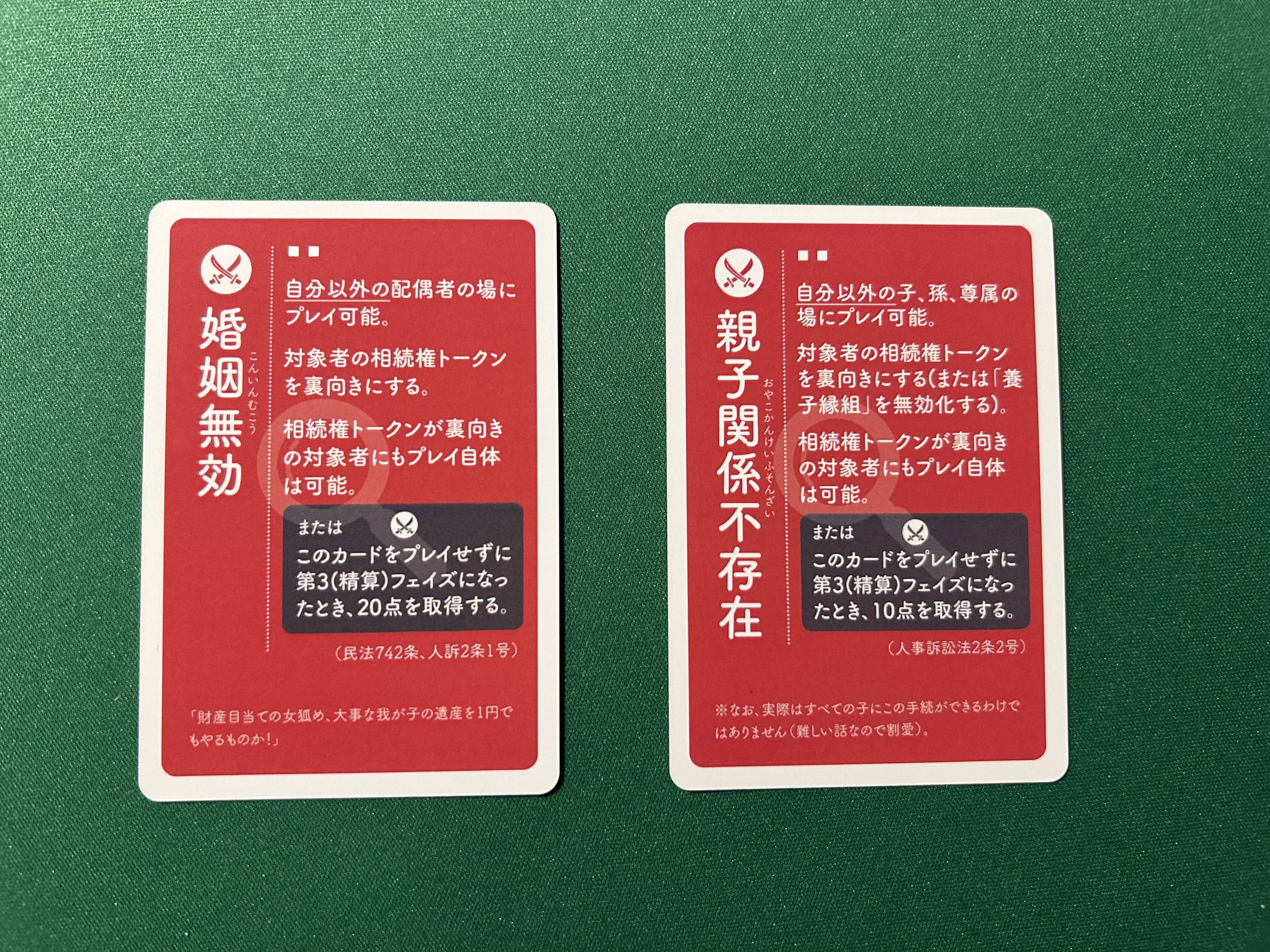 プレイヤー身分構成によっては死にカードになってしまっていた「婚姻無効」や「親子関係不存在」ですが、使用せずにラウンドを終了することで、点数化する効果を追加しました。