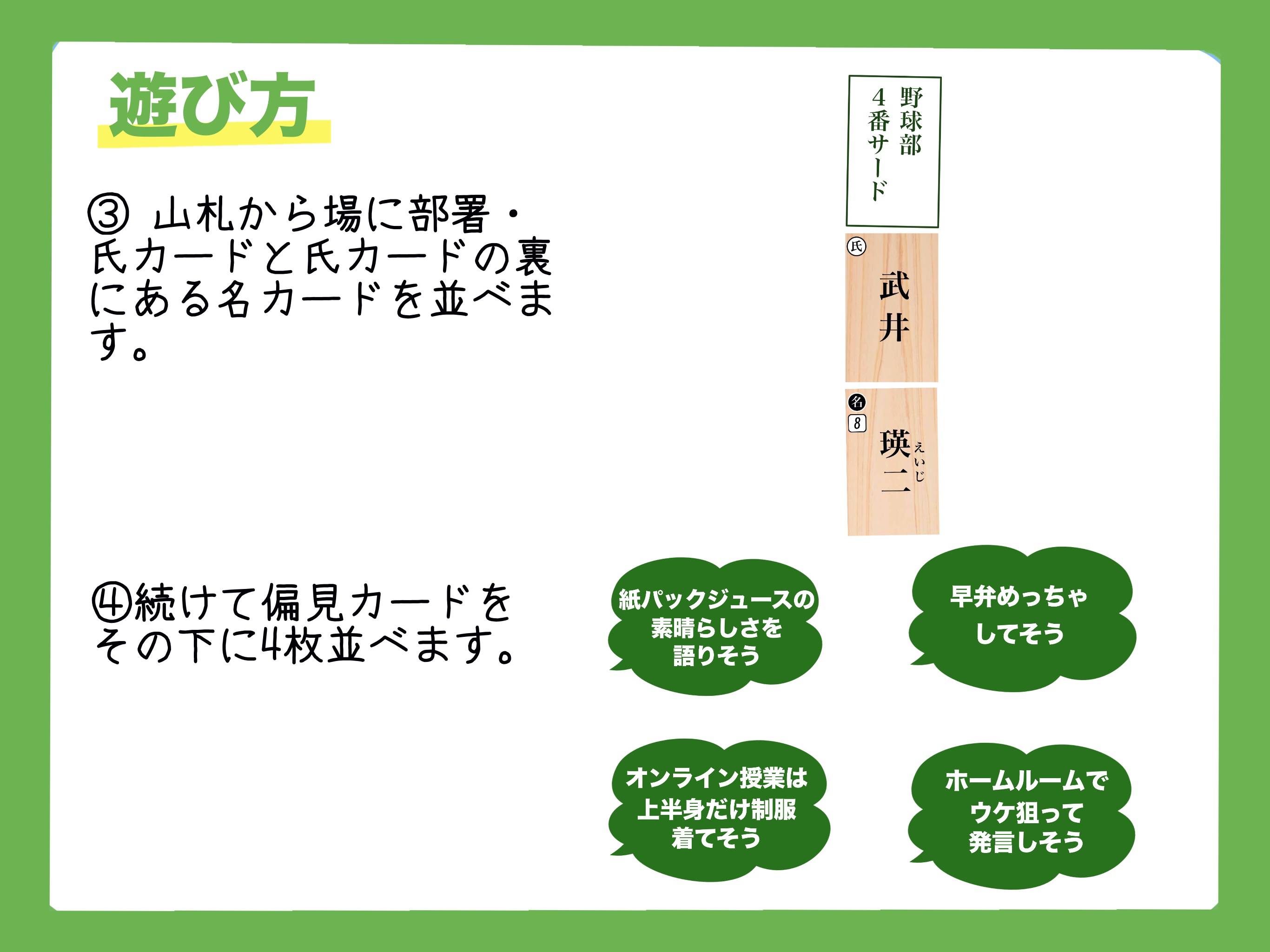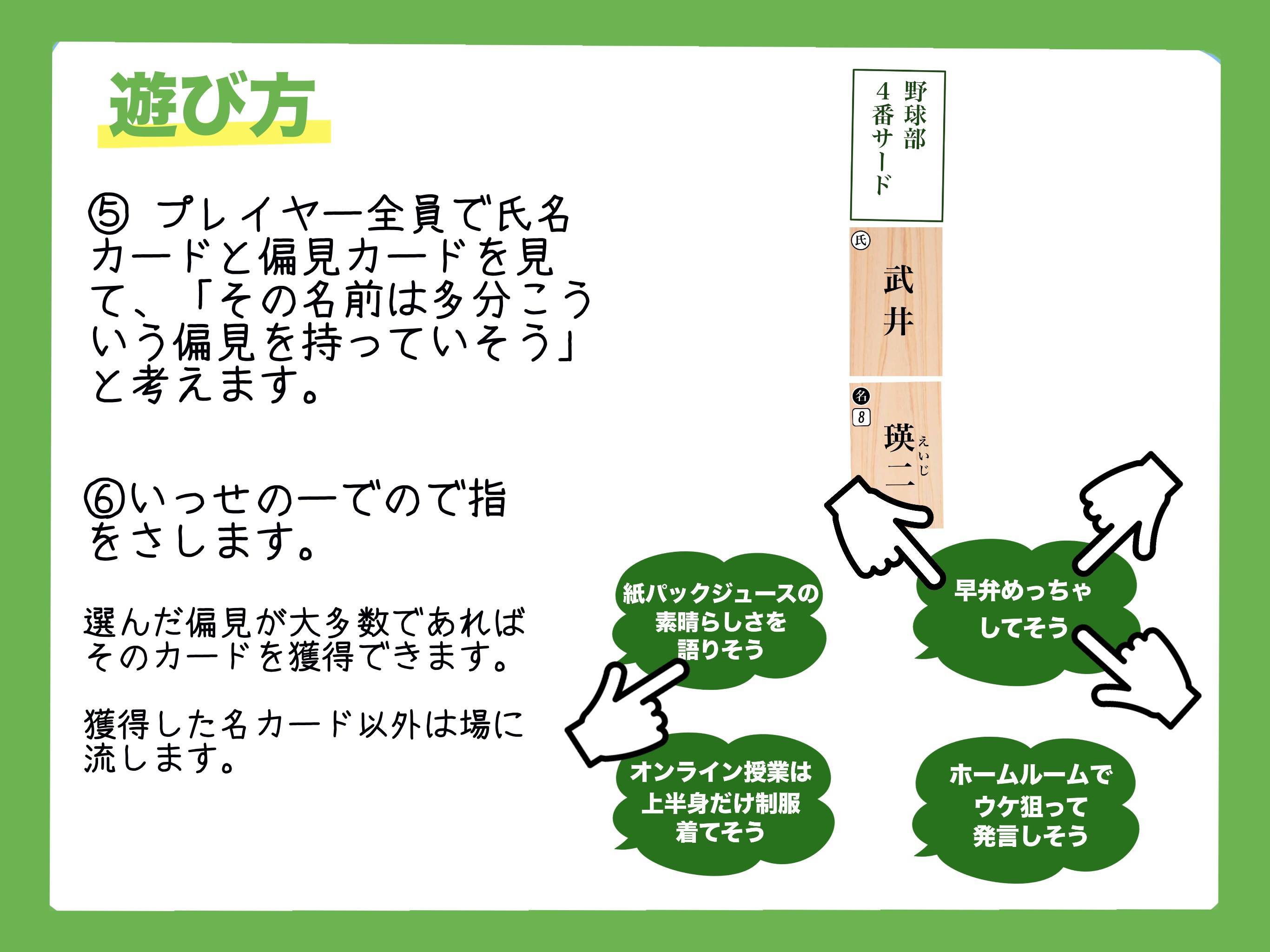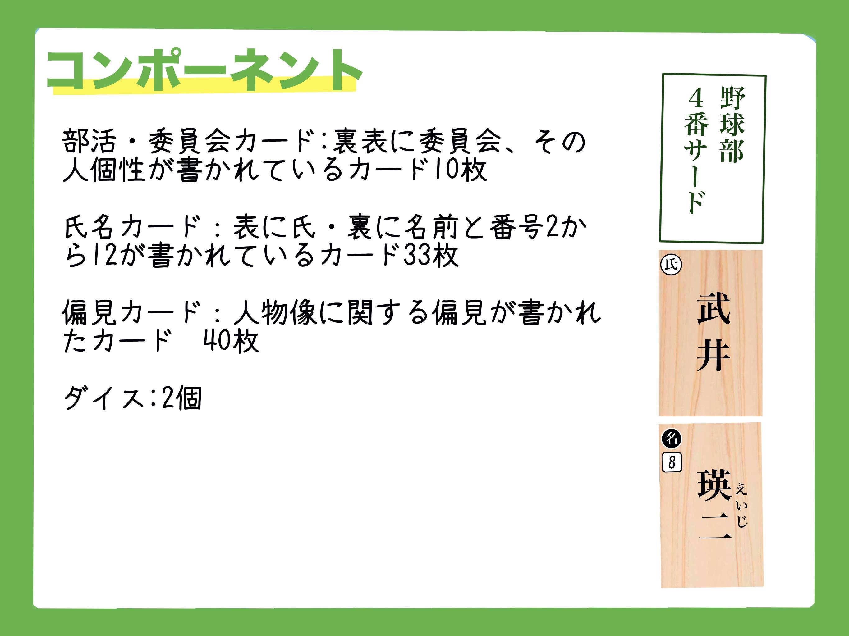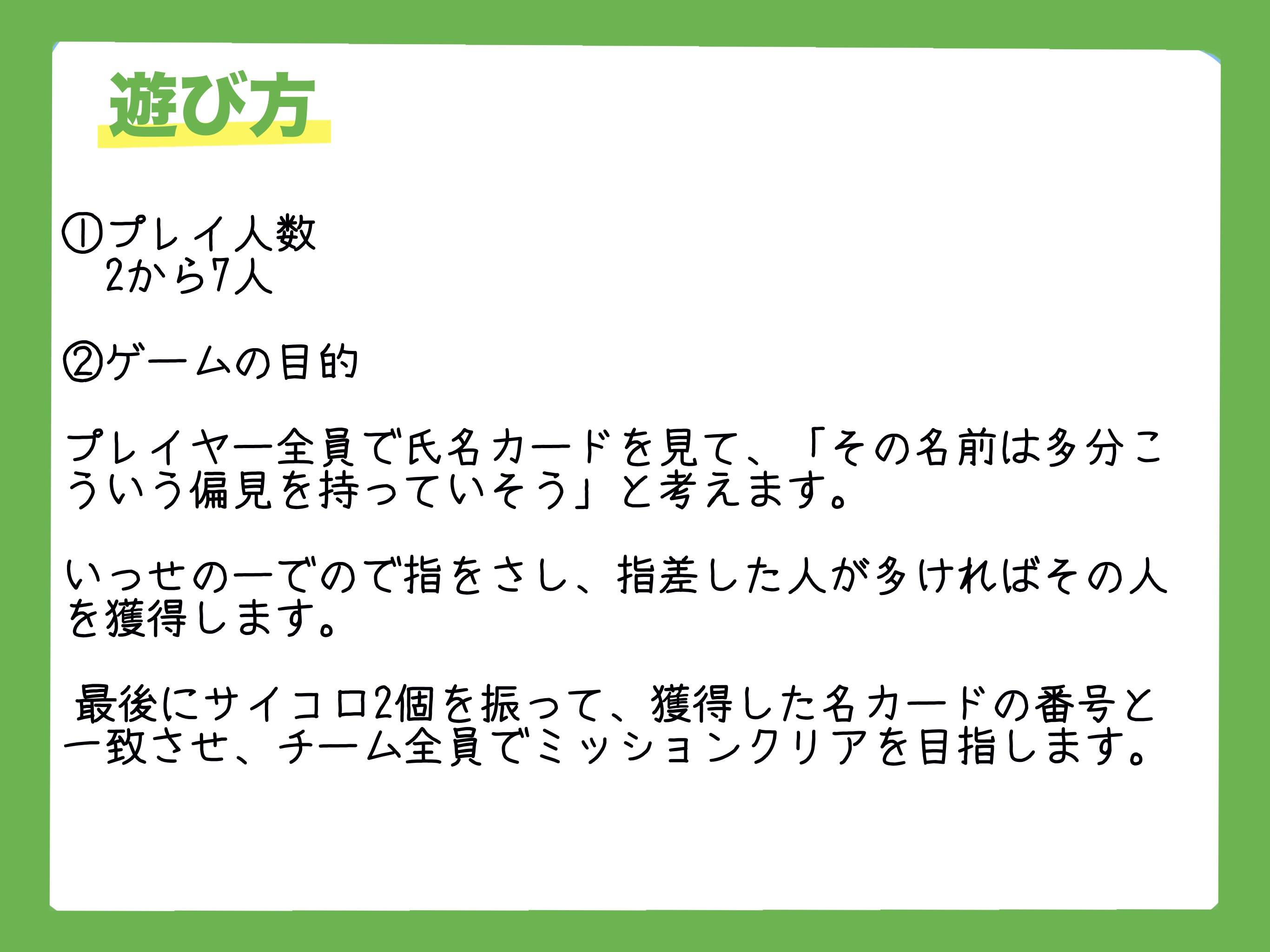2025秋 両 - K62 2025春 両 - J21 yunohana @yunohana110 3-7 15- 15歳〜 ド偏見×氏名 学校編 ¥1,300 修学旅行を取り戻すために!あいつの偏見を言い当てろ! ド偏見×氏名 学校編 ゲーム概要 部活や名前を見て4つの中から1つの偏見を指差すゲーム プレイ人数 3〜7人 プレイ時間15〜分 対象年齢15歳〜 価格1,300円 発売時期2025秋 予約 可 ゲームデザインYUNOHANA イラスト・DTP ゲーム詳細 この記事をシェア