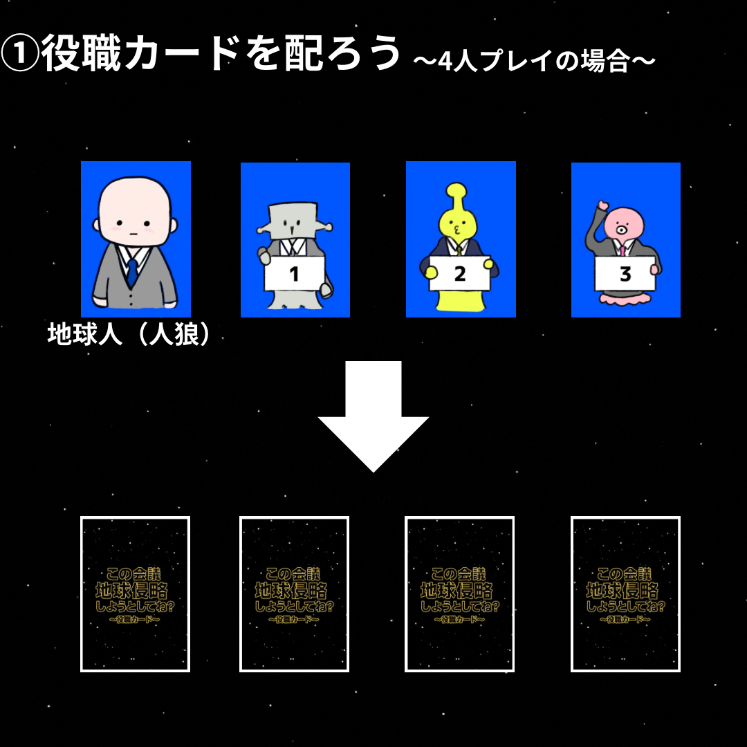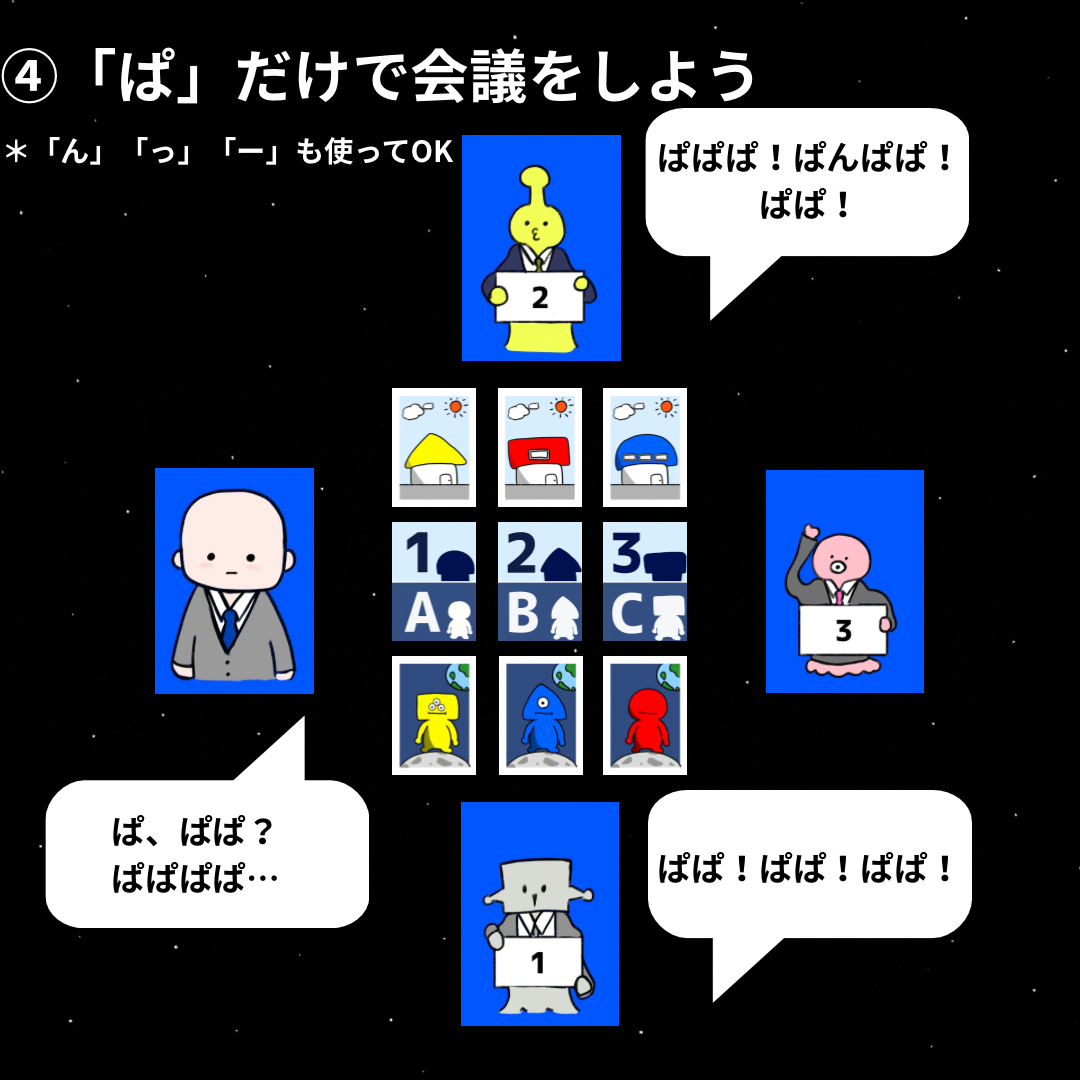 - 地球人🚶🏻♂️と宇宙人👽に分かれて宇宙語(ぱだけ)で会話!