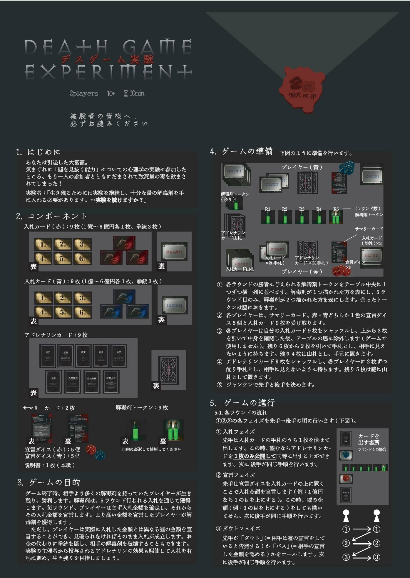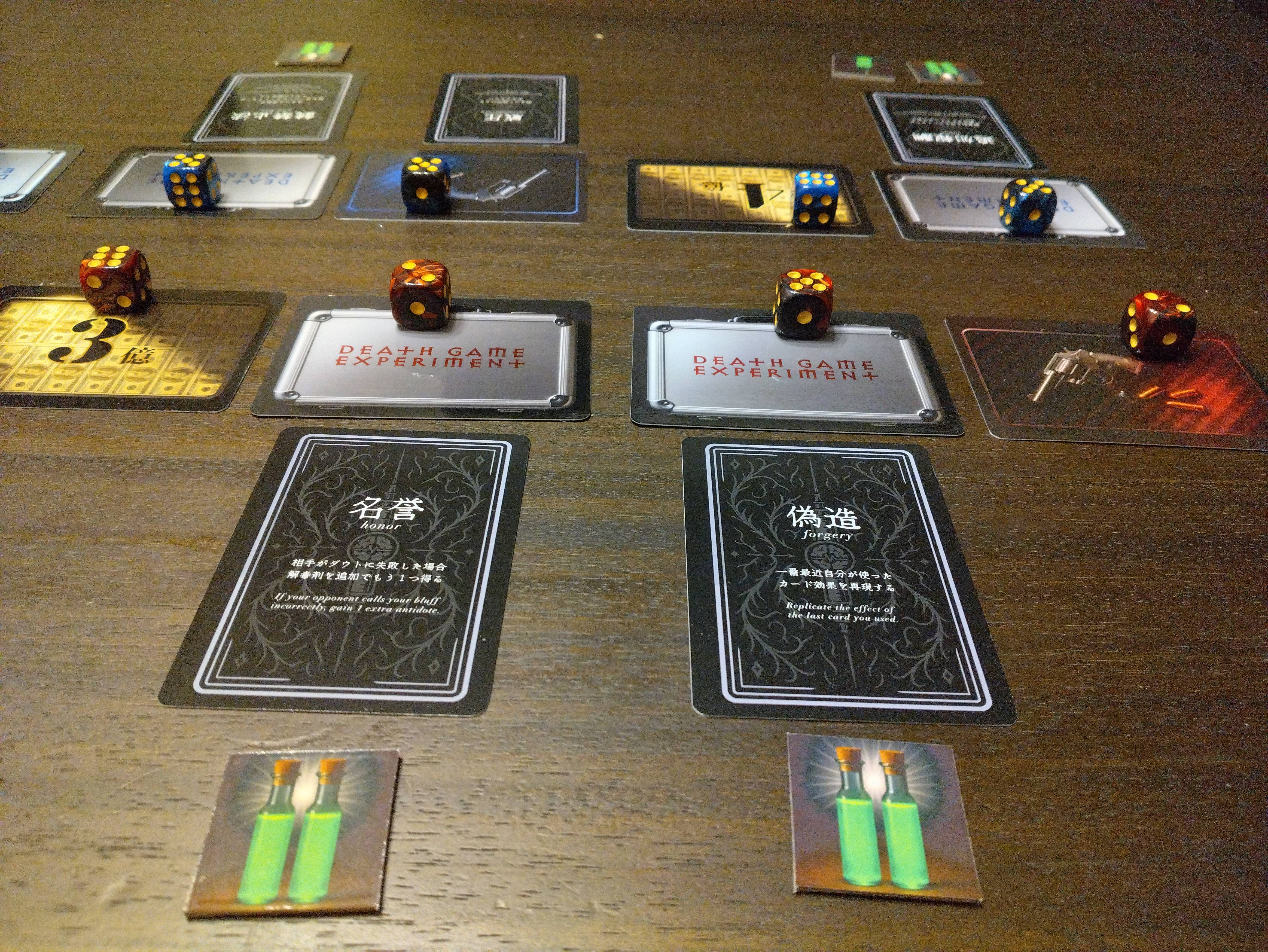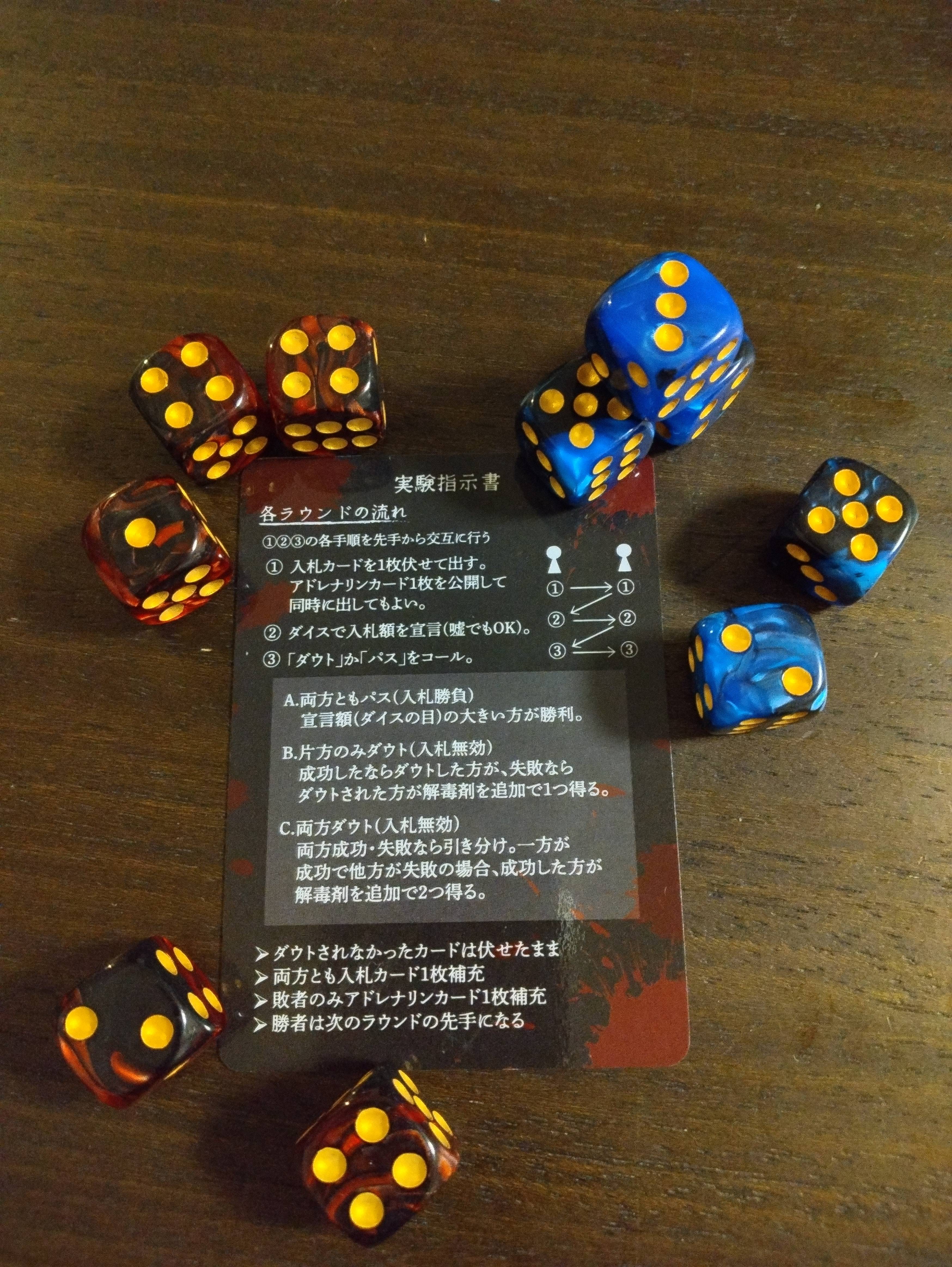 ただし、プレイヤーは実際に入札した金額とは異なる嘘の金額を宣言することができ、見破られなければそのまま入札が成立します。お金の代わりに拳銃を隠し、相手の解毒剤を破壊することもできます。実験の主催者から投与されるアドレナリンの効果も駆使して入札を有利に進め、生き残りを目指しましょう。