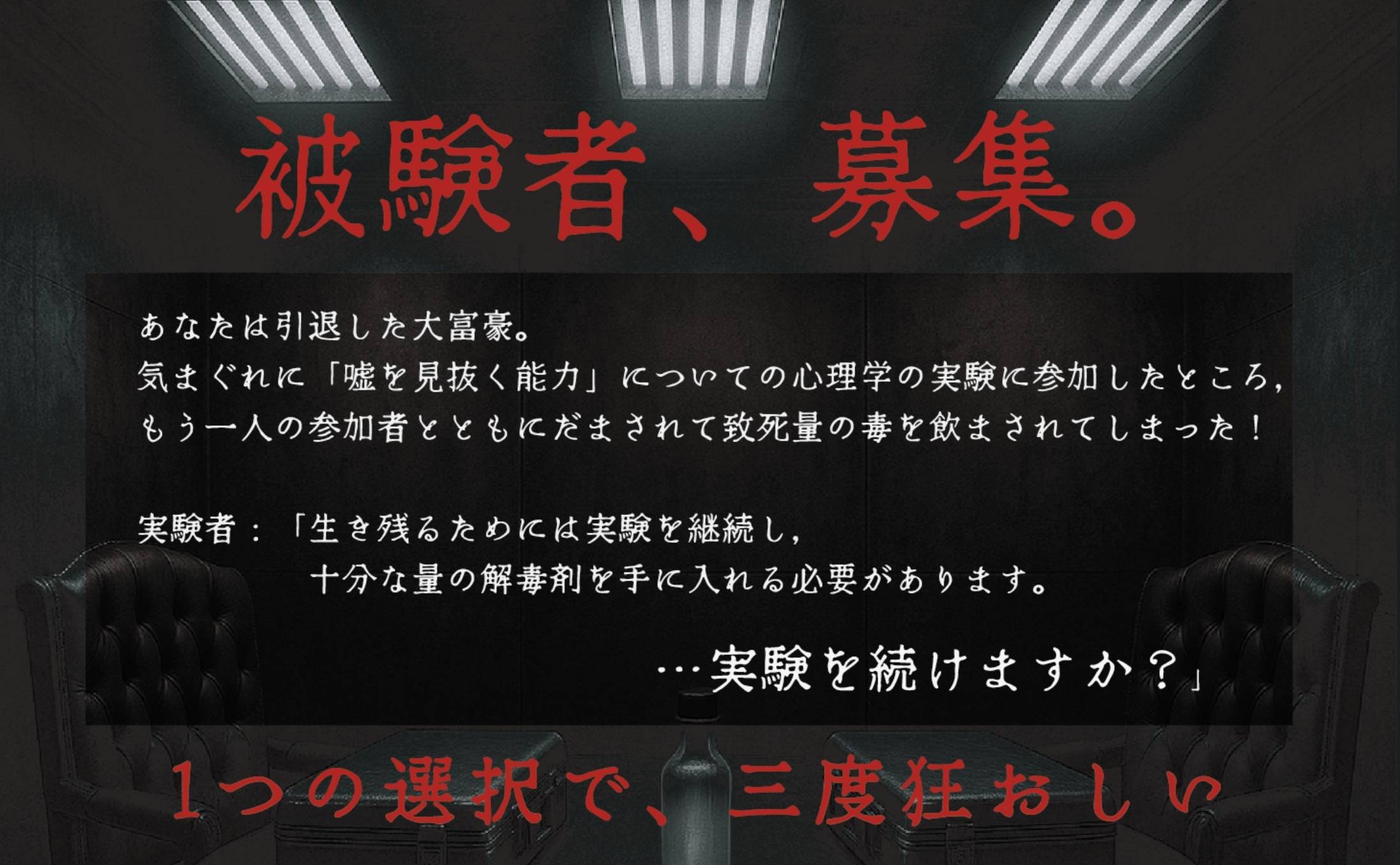 あなたは引退した大富豪。気まぐれに「嘘を見抜く能力」についての心理学の実験に参加したところ,もう一人の参加者とともにだまされて致死量の毒を飲まされてしまった!