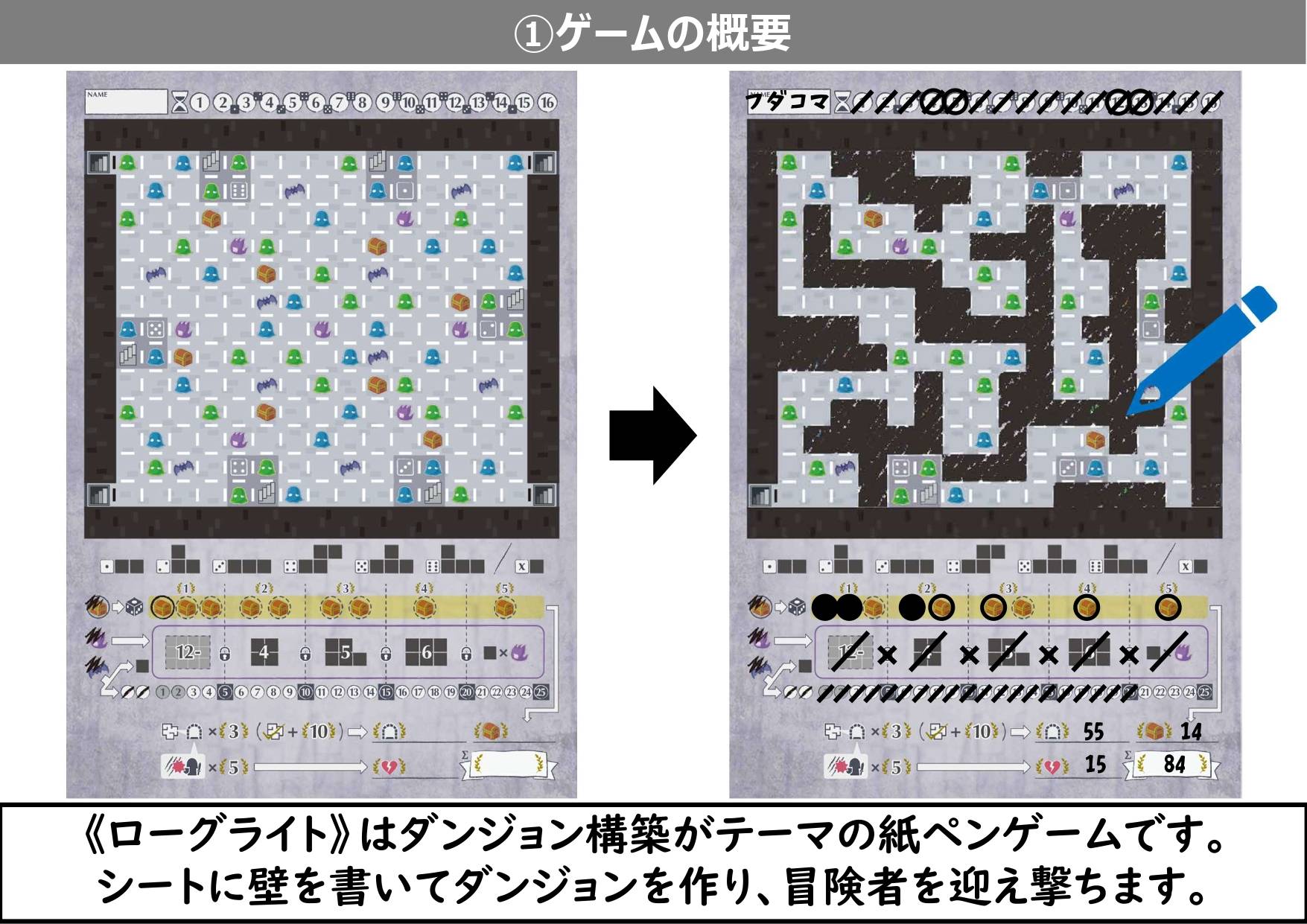 《ローグライト》は、ペンでマップに図形等を描き込む紙ペン系ボードゲームです。ソロ~6人まで遊べます。