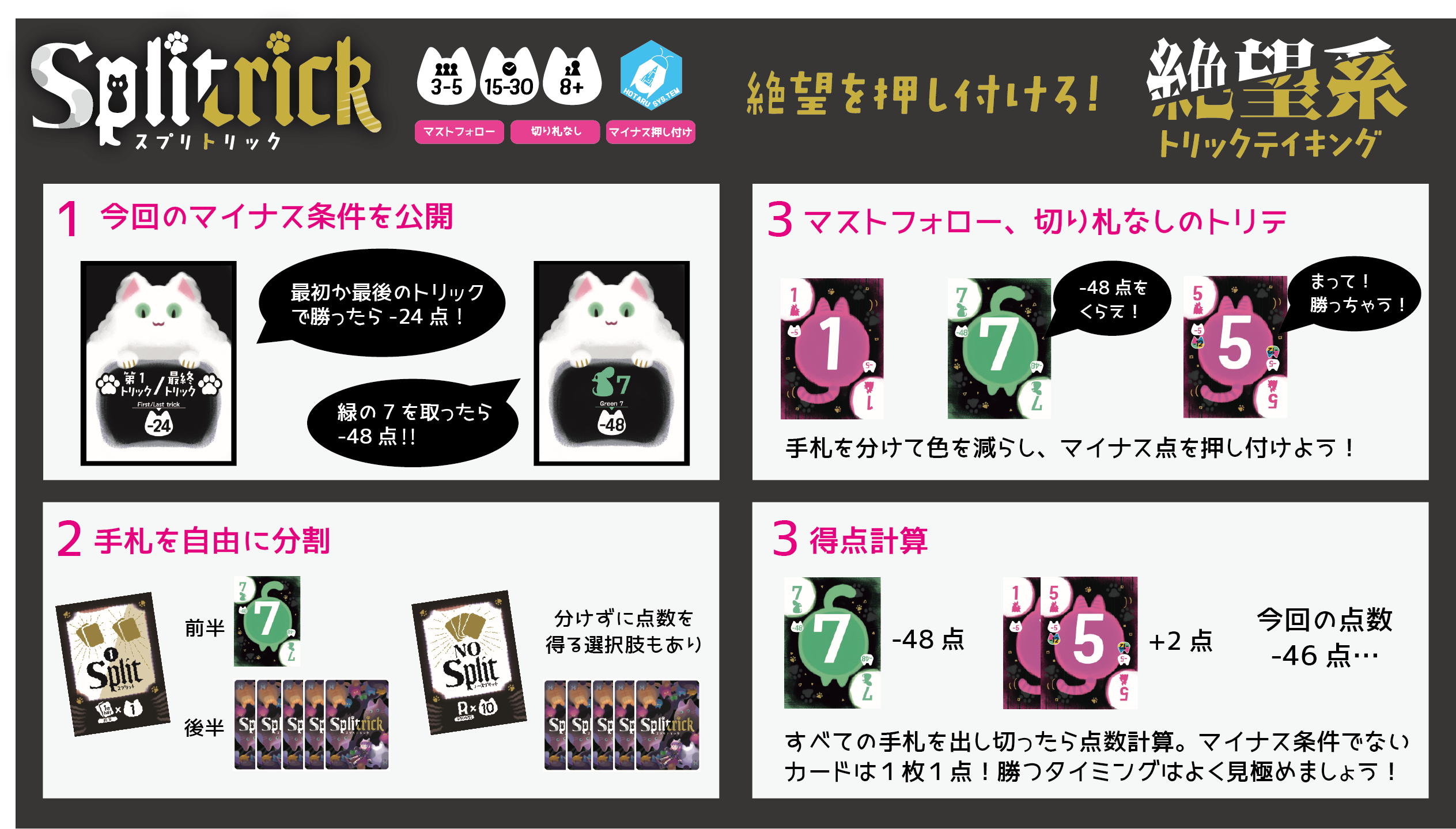『スプリトリック』はマストフォロー、切り札なし、特殊カードなしのシンプルなトリックテイキングゲームです。