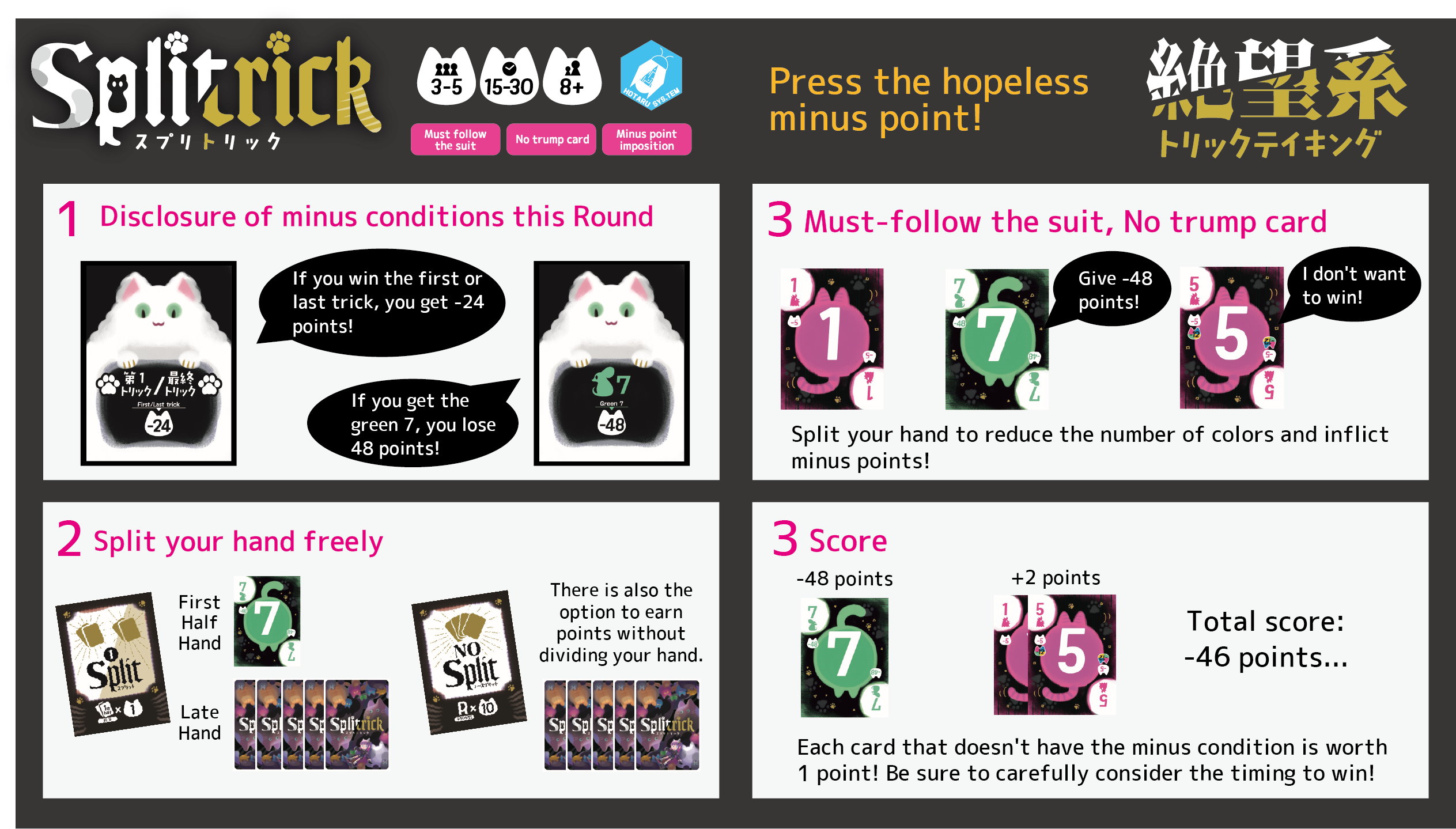 『スプリトリック』は絶望的なマイナス点を避けて減点を抑えるタイプのトリックテイキングゲームです。