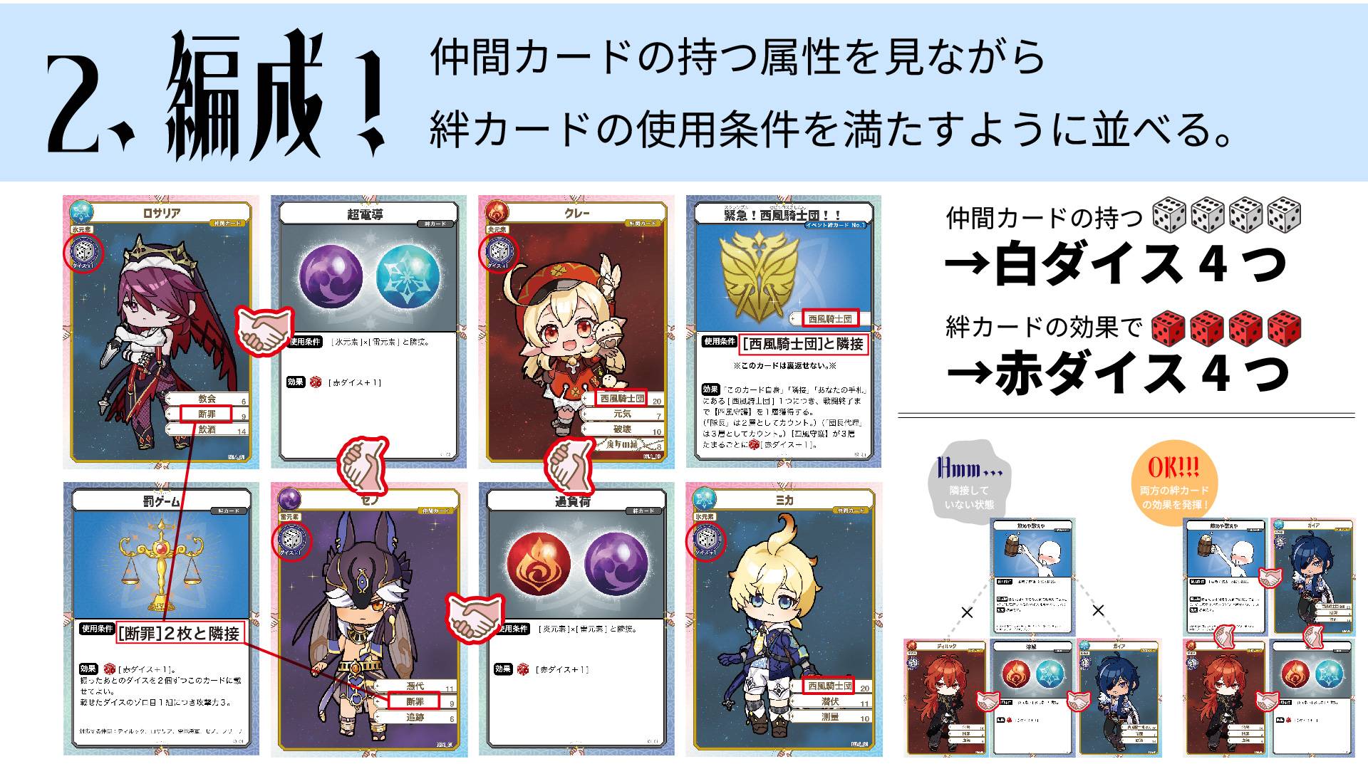一方の絆カードには「感電」「蒸発」といった元素反応だけでなく、仲間の属性(「断罪」や「追跡」など)が 使用条件になっているものも用意されています。