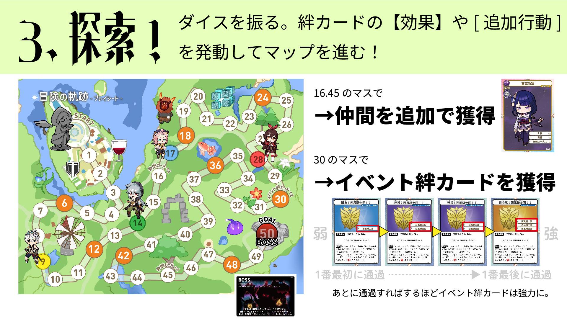 なお30マスの「イベント絆カード+1」は編成に失敗したり出遅れている人に対する救済措置にもなっており、後から通過する人ほどもらえるカードの性能が強化されます。