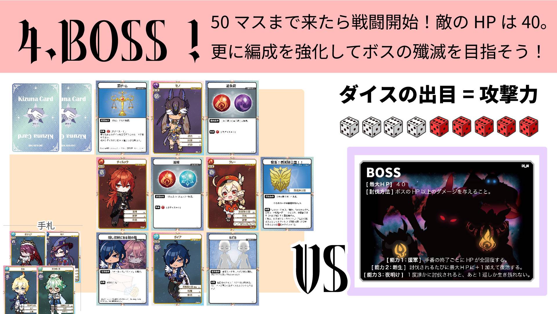 千風の神殿(50マス)に辿り着いたプレイヤーから BOSS との戦闘が始まります。 BOSS は与えたダメージをすぐに回復するため、仲間とたくさんの絆を作り、一度の攻撃で BOSS を倒しましょう。