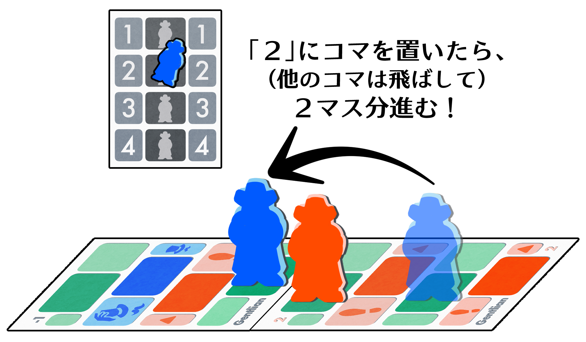 コマを置いた後のアクションですが、「置かれているコマ1つを選び、その色のコマを、置かれている数字だけ進ませる」が正しかったです。